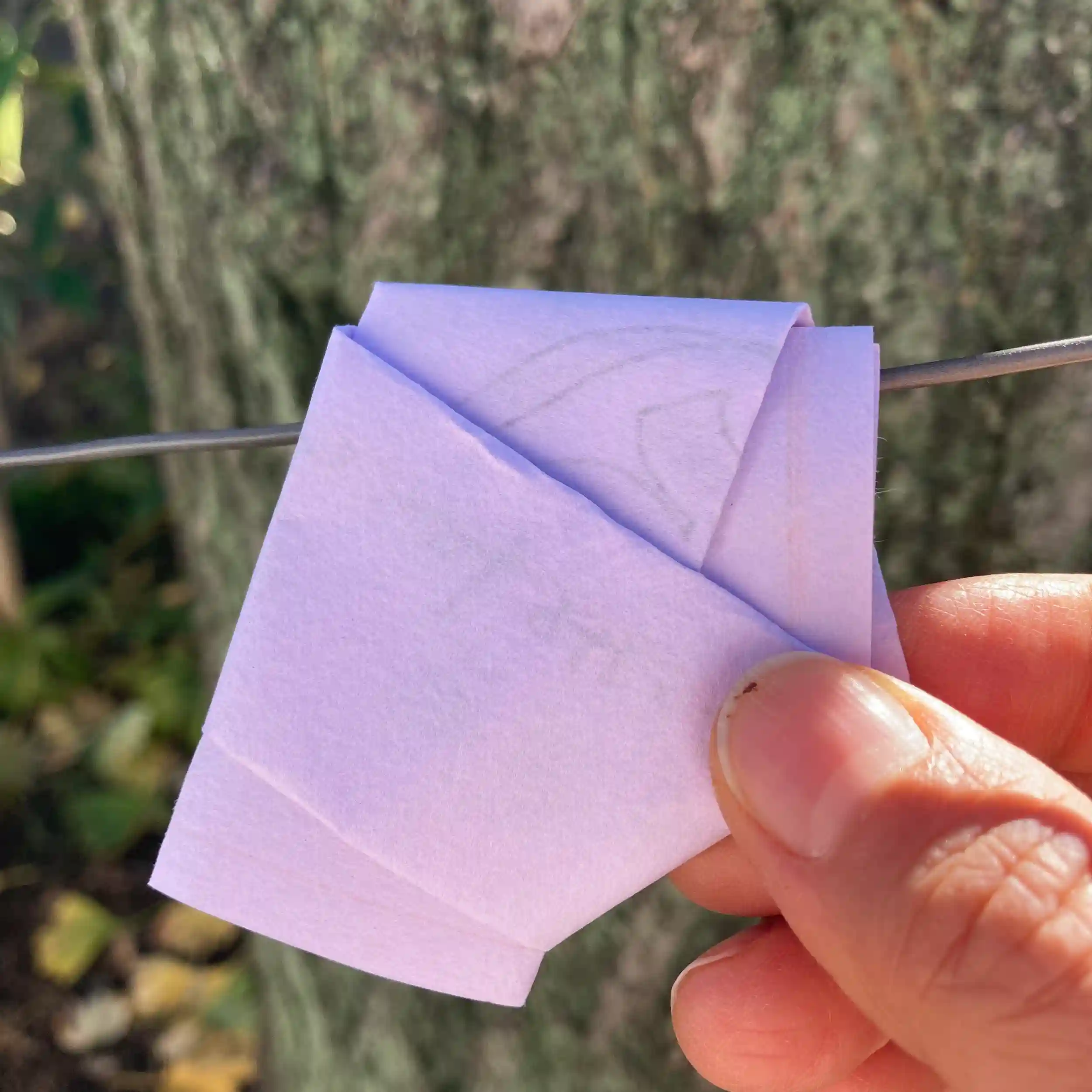 5.細長くたたみ、絵馬かけにむすびます。