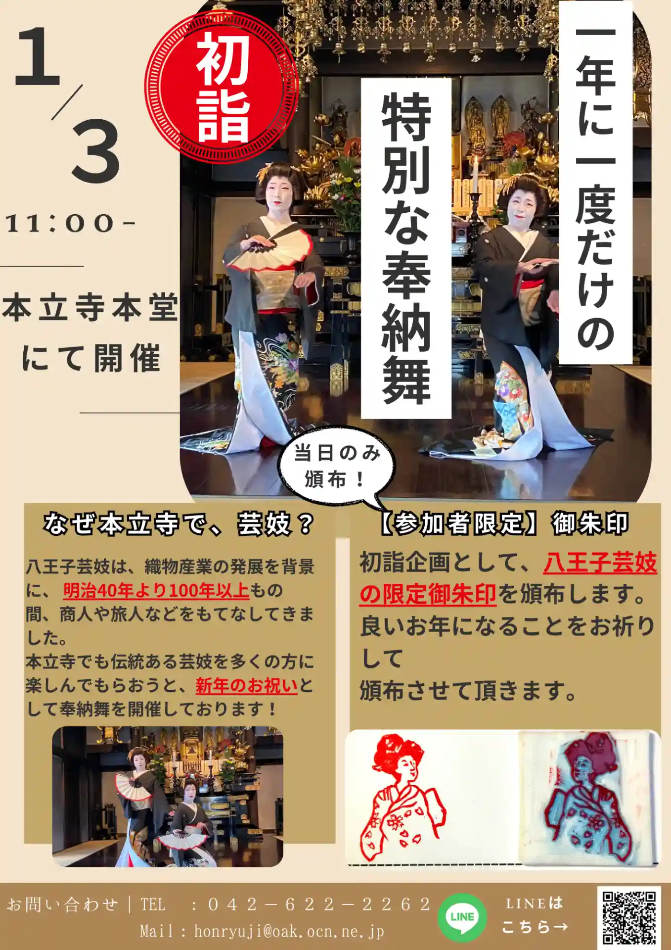 この八王子芸妓の舞を、新年のお祝いとして本立寺で見ることができる貴重な機会です。