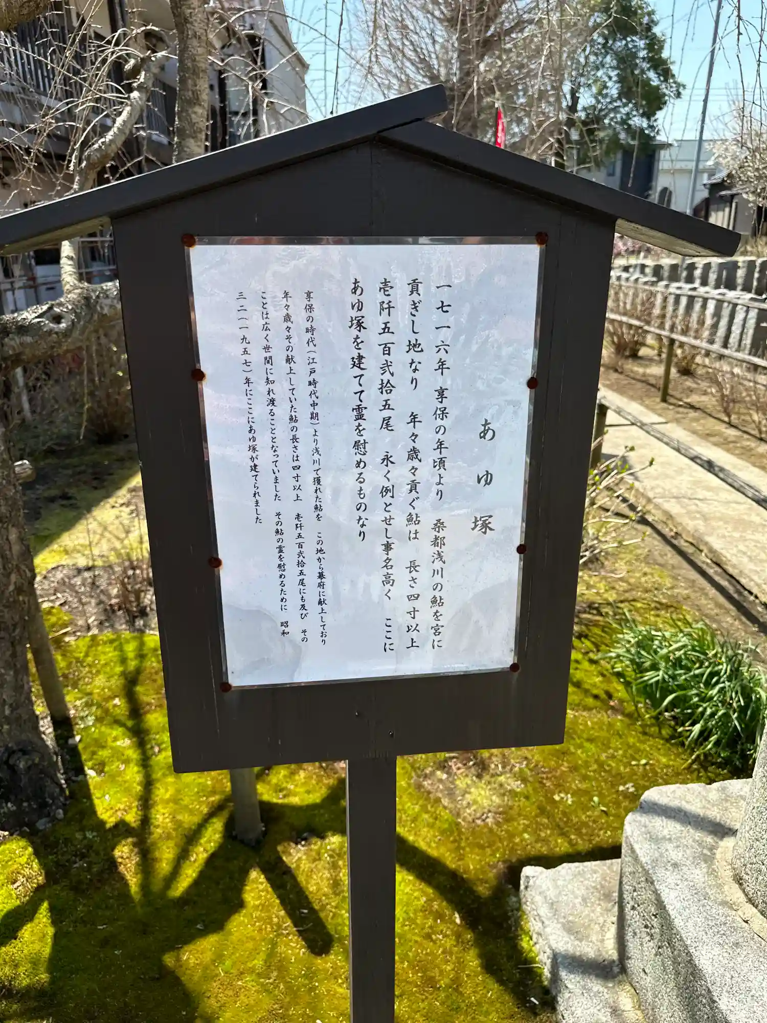 江戸時代中期より近くを流れる浅川で取れた鮎をこの地から幕府に献上しており、その霊を慰めるために昭和32年に建立された。