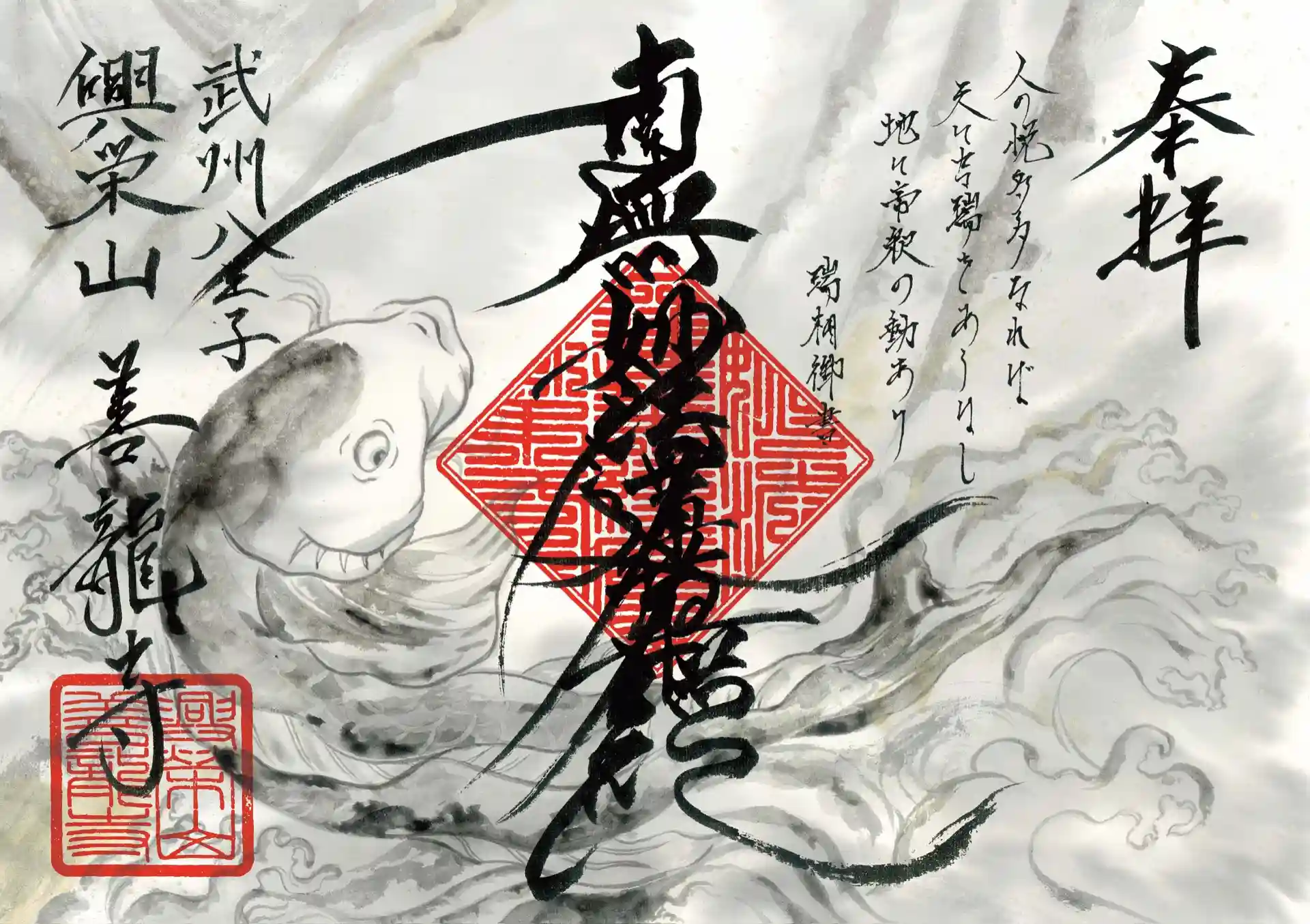 お知らせが遅れましたが、5月の御首題は滝を昇る鯉を描きました。
