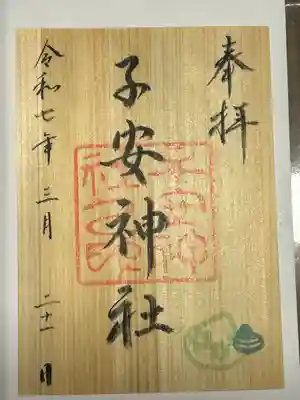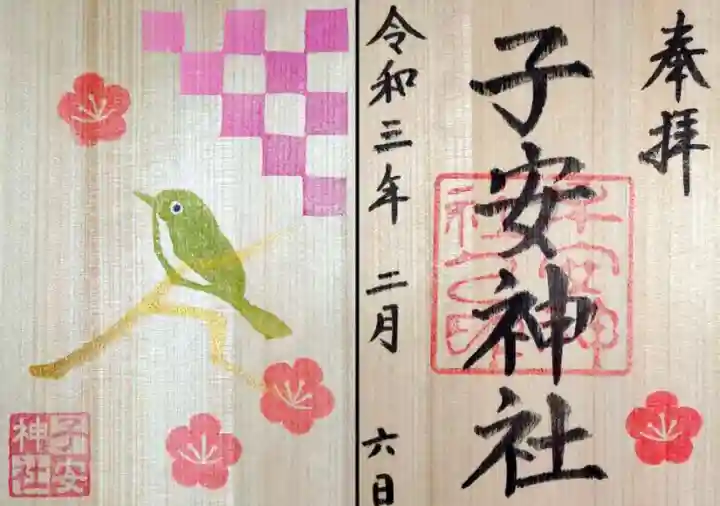 裏表両面に記帳及びデザインが施された木材の御朱印で、表面は真ん中に子安神社と書かれ、右下に梅の花のイラスト、真ん中に子安神社之印、裏面はメジロと梅の花のイラスト、右上にピンク色の市松文様、左下に子安神社の印が押されています。
