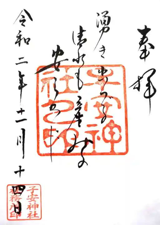 真ん中に俳句「湧き出づる 清水も産みの 安らかに」が書かれ、その下に子安神社之印、左下に子安神社社務所印が押されています。