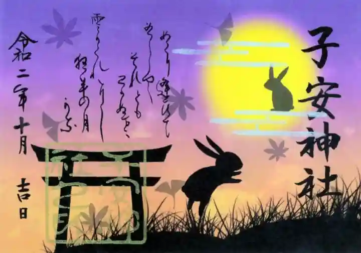 黄昏時、仲秋の名月にウサギと鳥居のシルエット、カエデとイチョウがデザインされた二面見開きの御朱印で、右に子安神社の文字、左上に和歌「めぐり逢ひて 見しやそれともわかぬ間に 雲がくれにし 夜半の月かな」、左下に金色で子安神社之印が押されています。