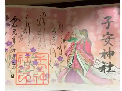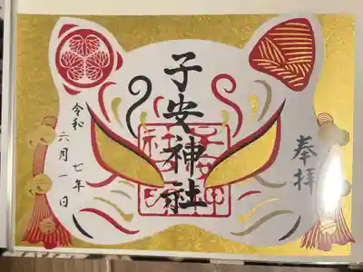 梅の花柄に花菱文様が施された二面見開きの御朱印で、真ん中に丑の文字、右に子安神社の文字、左上に短歌、左下に金色で子安神社之印が押されています。
