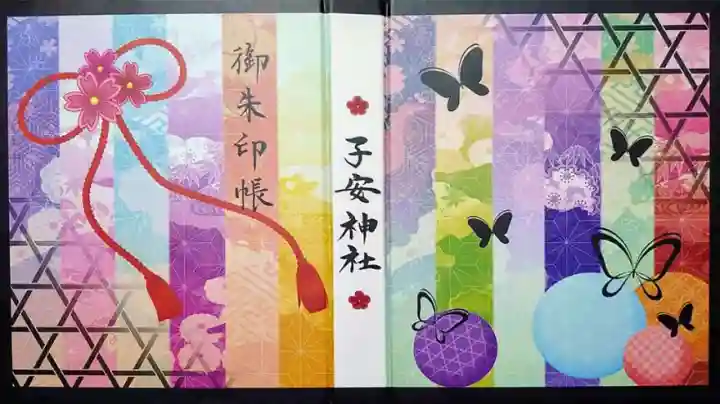 真ん中に梅柄と子安神社の文字が入り、籠目、麻の葉、紗綾形、七宝などの吉祥文様がカラフルに施された御朱印帳で、表面は桜の帯紐、右上に御朱印帳の文字、裏面は蝶柄がデザインされています。