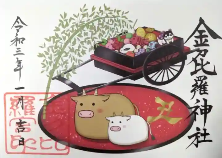 二面見開きの御朱印です。朱塗漆器に二匹の牛のイラストと丑の金字、竹のイラスト、小判、福袋、鯛、雪うさぎ、蜜柑、三色団子、梅の花の和菓子などが入った牛車の重箱が描かれ、右に金刀比羅神社の文字、左下に金刀比羅宮印が押されています。