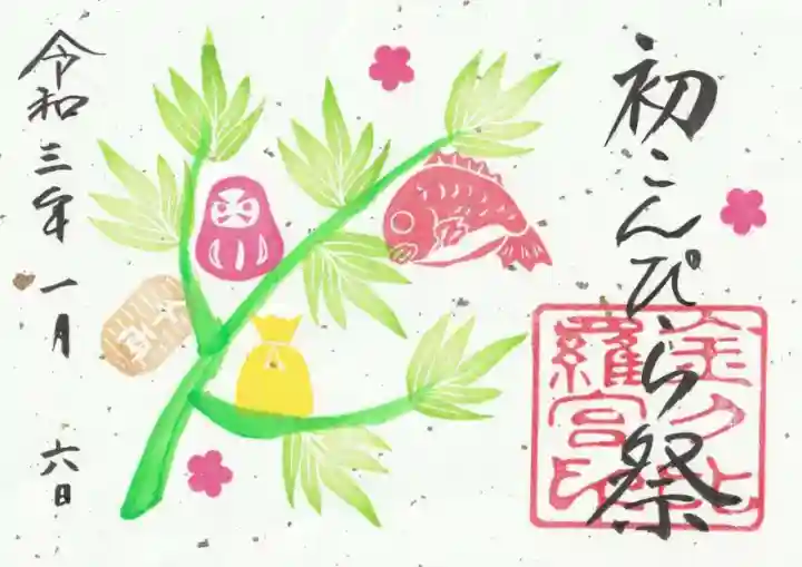 梅柄、植物、達磨、千両小判、巾着袋、鯛がデザインされた二面見開きの御朱印で、右面は初こんぴら祭の文字、金刀比羅宮印が押されています。