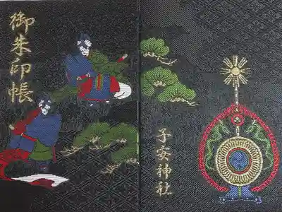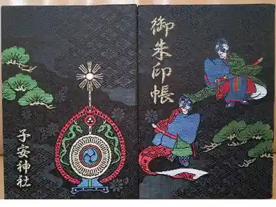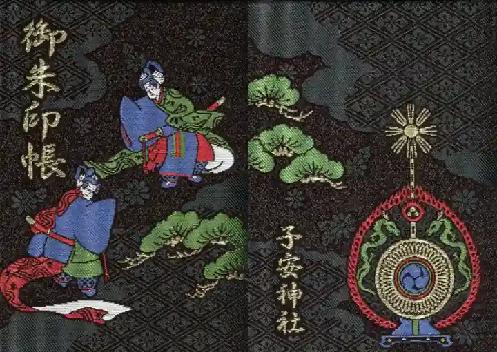 黒色の地に花柄と花菱文様、松が描かれた御朱印帳で、表面は源氏物語の青海波の舞をイメージしたデザイン、左上に御朱印帳の文字、裏面は鼉太鼓(だだいこ)がデザインされ、左下に子安神社の文字が入っています。