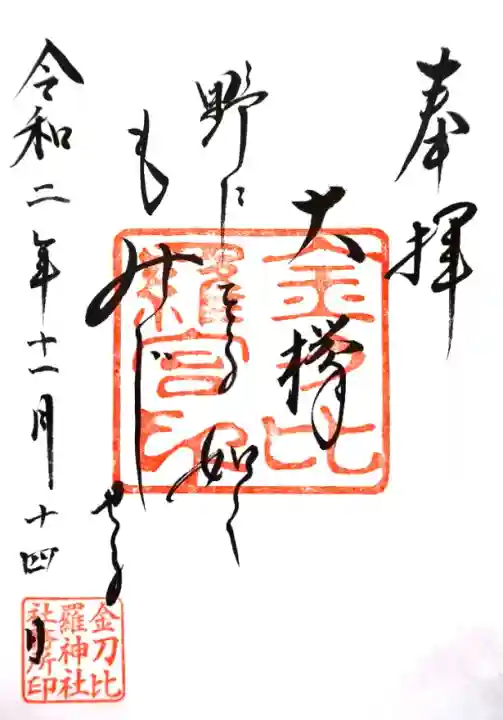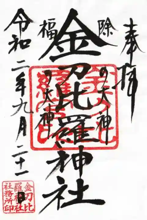 真ん中に金刀比羅神社と書かれ、両脇に「除の大神 福の大神」の文字、真ん中に金刀比羅宮印、左下に金刀比羅神社社務所印が押されています。