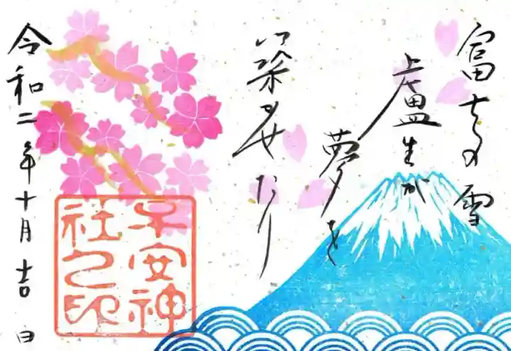 二面見開きの御朱印で、右面は芭蕉の句「富士の雪 盧生が夢を 築かせたり」が書かれ、富士山と青海波、桜の花びらが描かれ、左面は上部に桜の花、下部に子安神社之印が押されています。