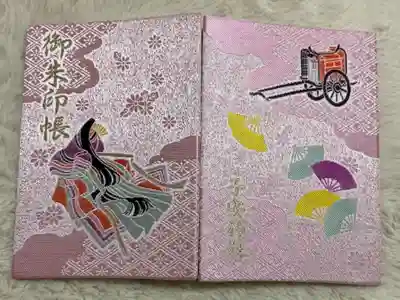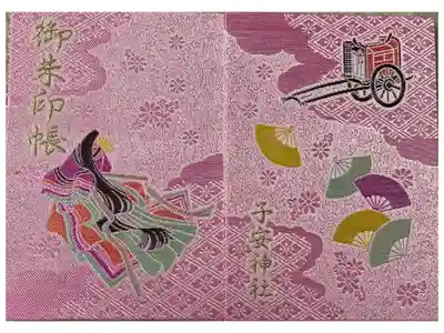 ピンク色の地に花柄と花菱文様、表面は十二単を纏った女性がデザインされ、左上に御朱印帳の文字、裏面は右上に牛車、真ん中にカラフルな扇子が描かれ、左下に子安神社の文字が入っています。