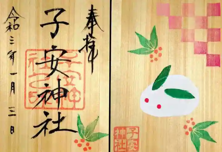 裏表両面に記帳及びデザインが施された木材の御朱印で、表面は真ん中に子安神社と書かれ、右下にナンテンのイラスト、真ん中に子安神社之印、裏面は雪うさぎとナンテンのイラスト、右上にえんじ色の市松文様、左下に子安神社の印が押されています。
