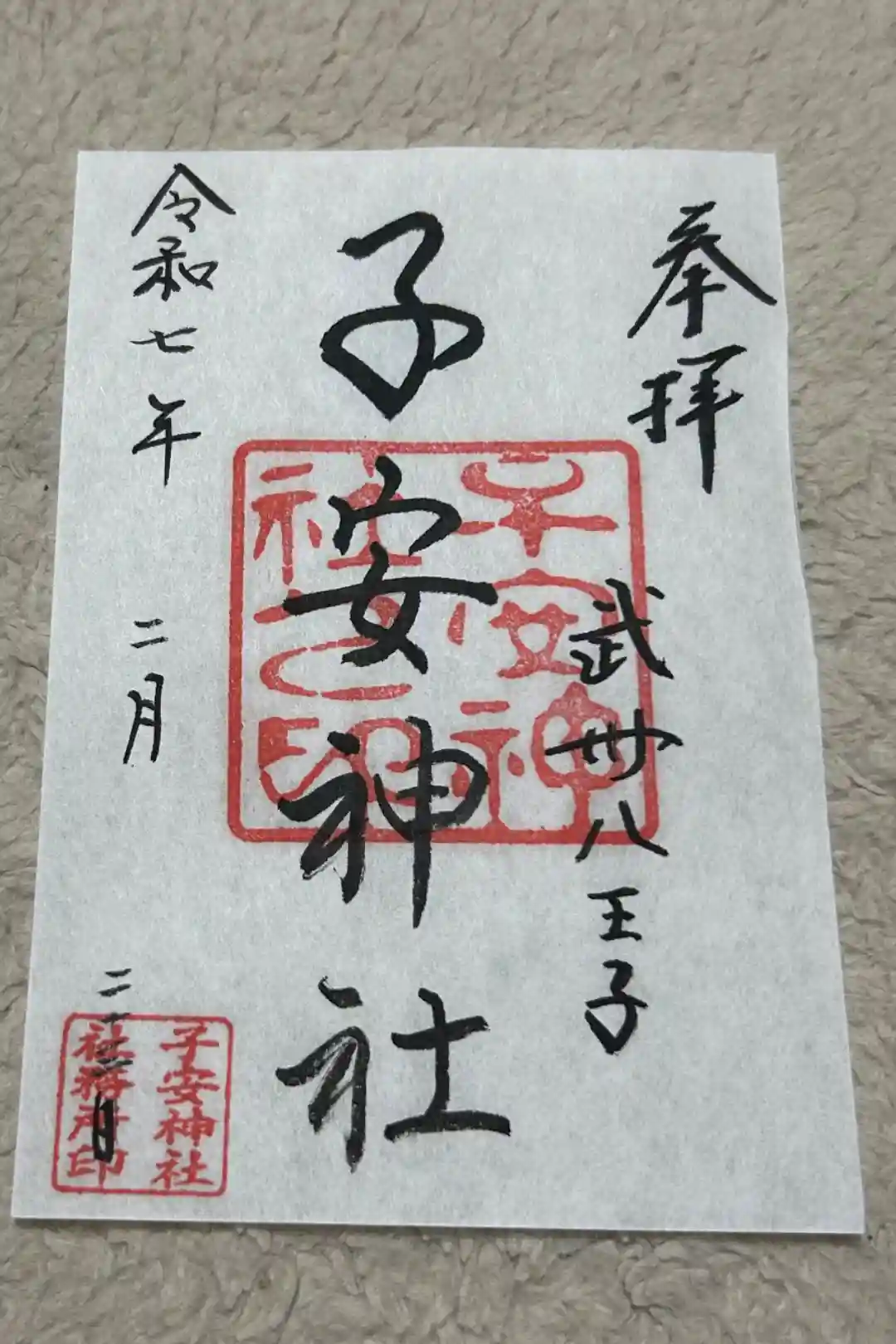 真ん中に子安神社と書かれ、右に武州八王子の文字、真ん中に子安神社之印、左下に子安神社社務所印が押されています。