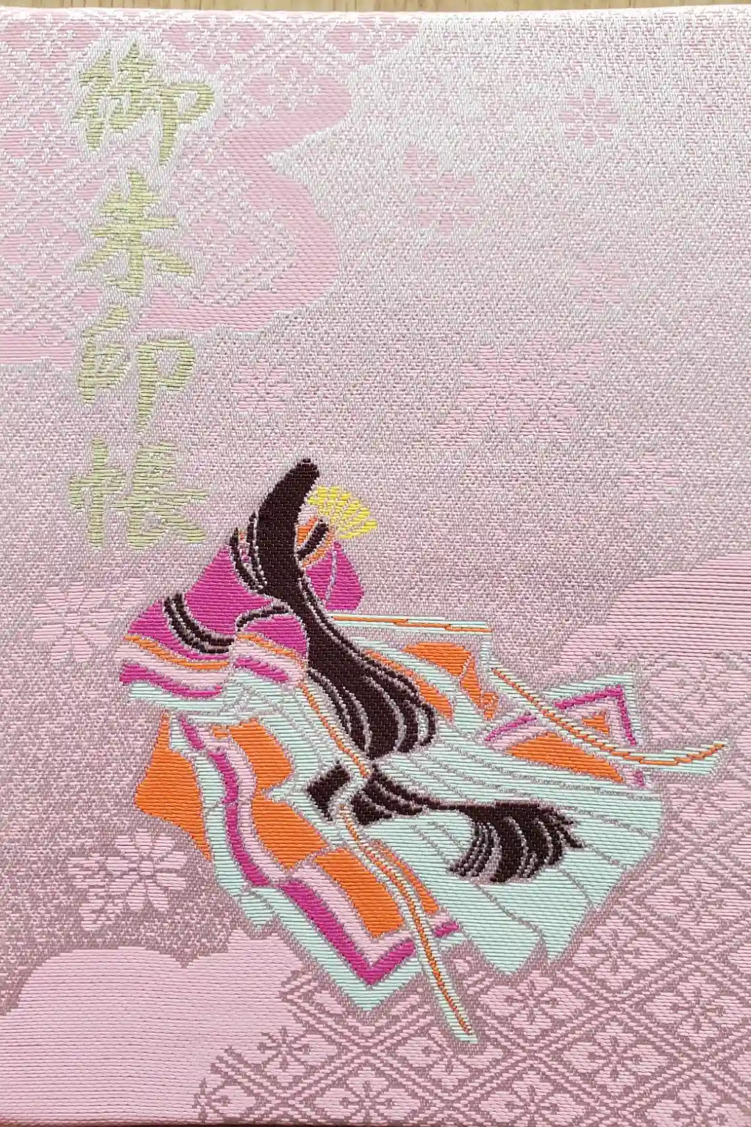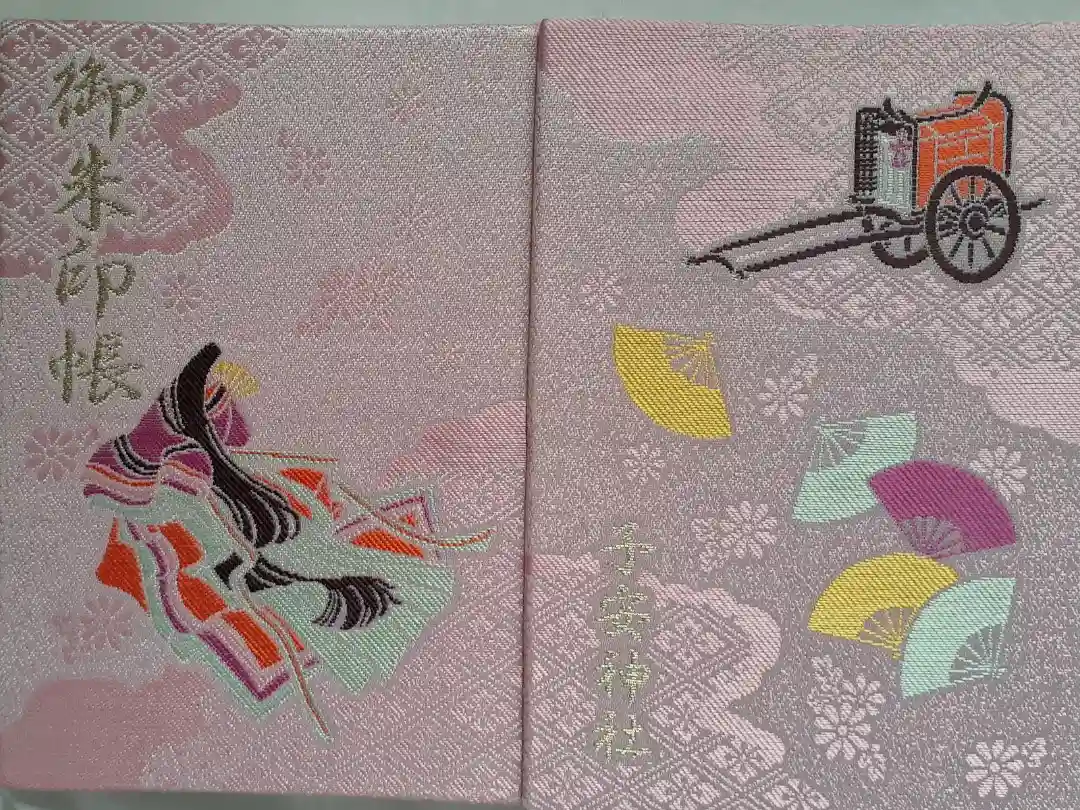 ピンク色の地に花柄と花菱文様、表面は十二単を纏った女性がデザインされ、左上に御朱印帳の文字、裏面は右上に牛車、真ん中にカラフルな扇子が描かれ、左下に子安神社の文字が入っています。
