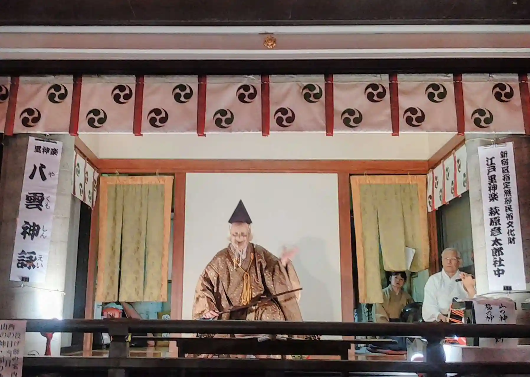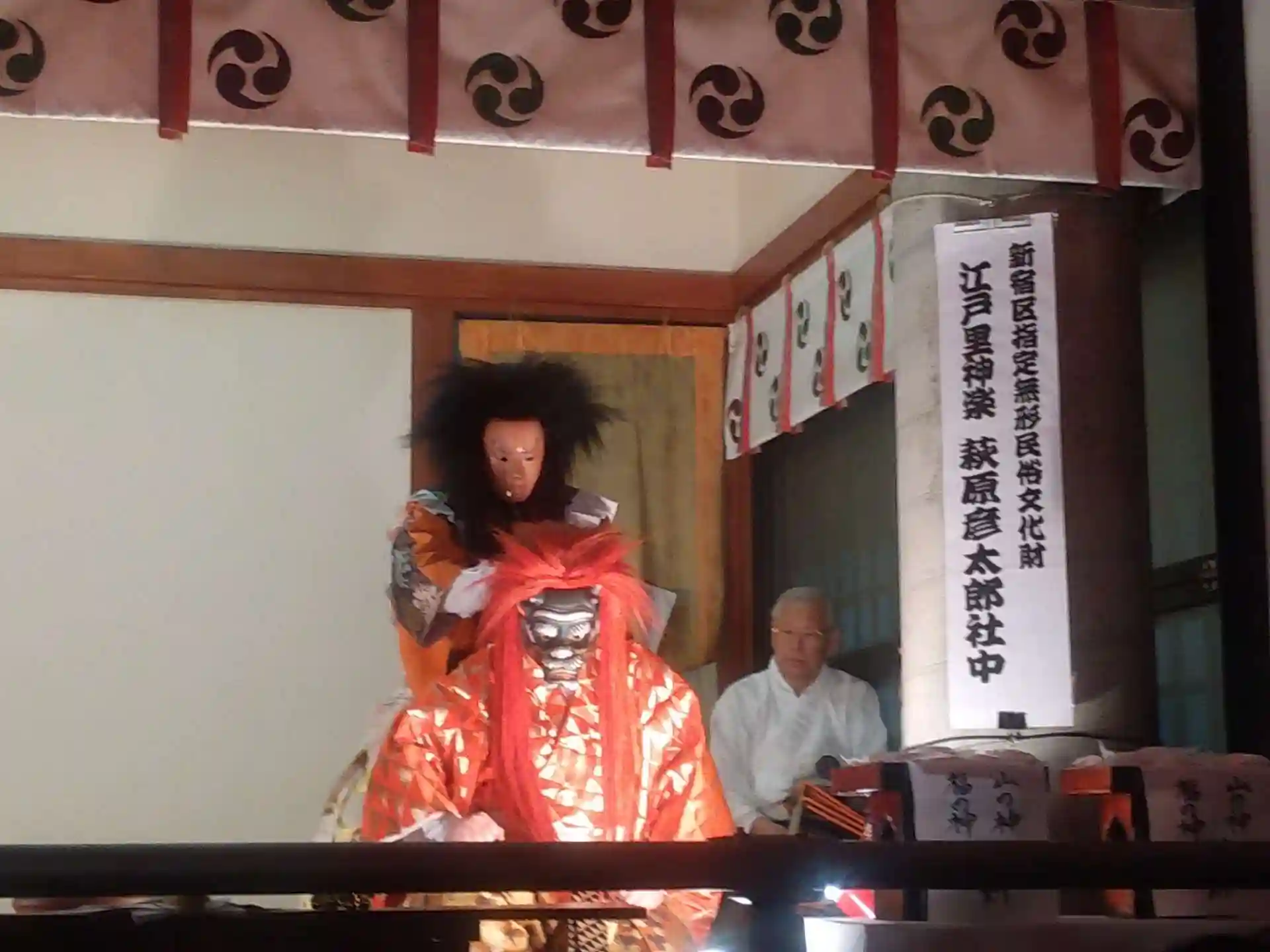 酉毎に上演されるプログラムが異なり、さらに年によっても内容が違うそうです。ただ、最後の演目は「山神(さんじん)」で決まっていているそうです。演目終了後、祝いの投げ餅も行われました。周りの人は上に手を挙げていて誰かの腕に当たって私のところに投げ餅が、運良く頂くことができました。