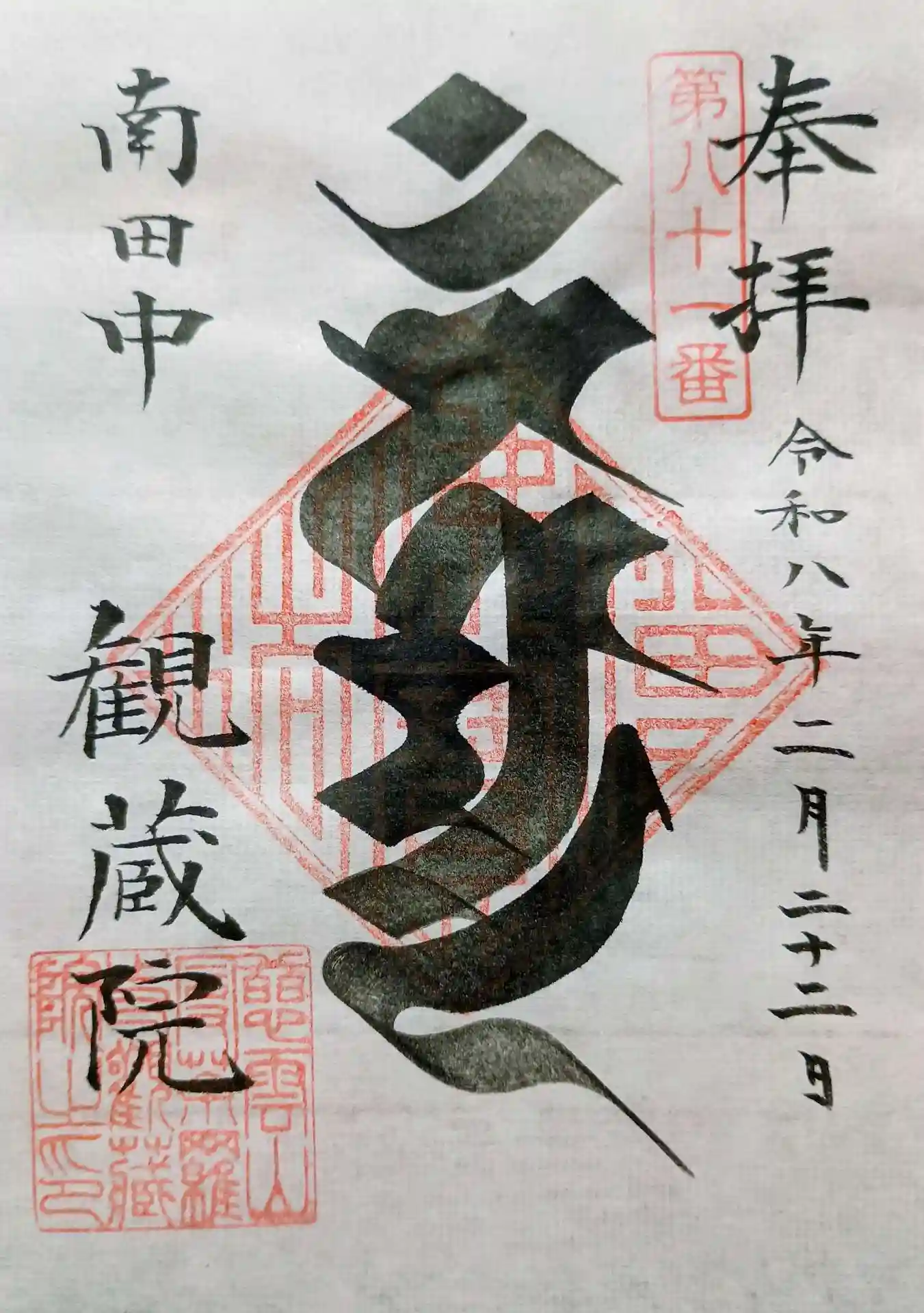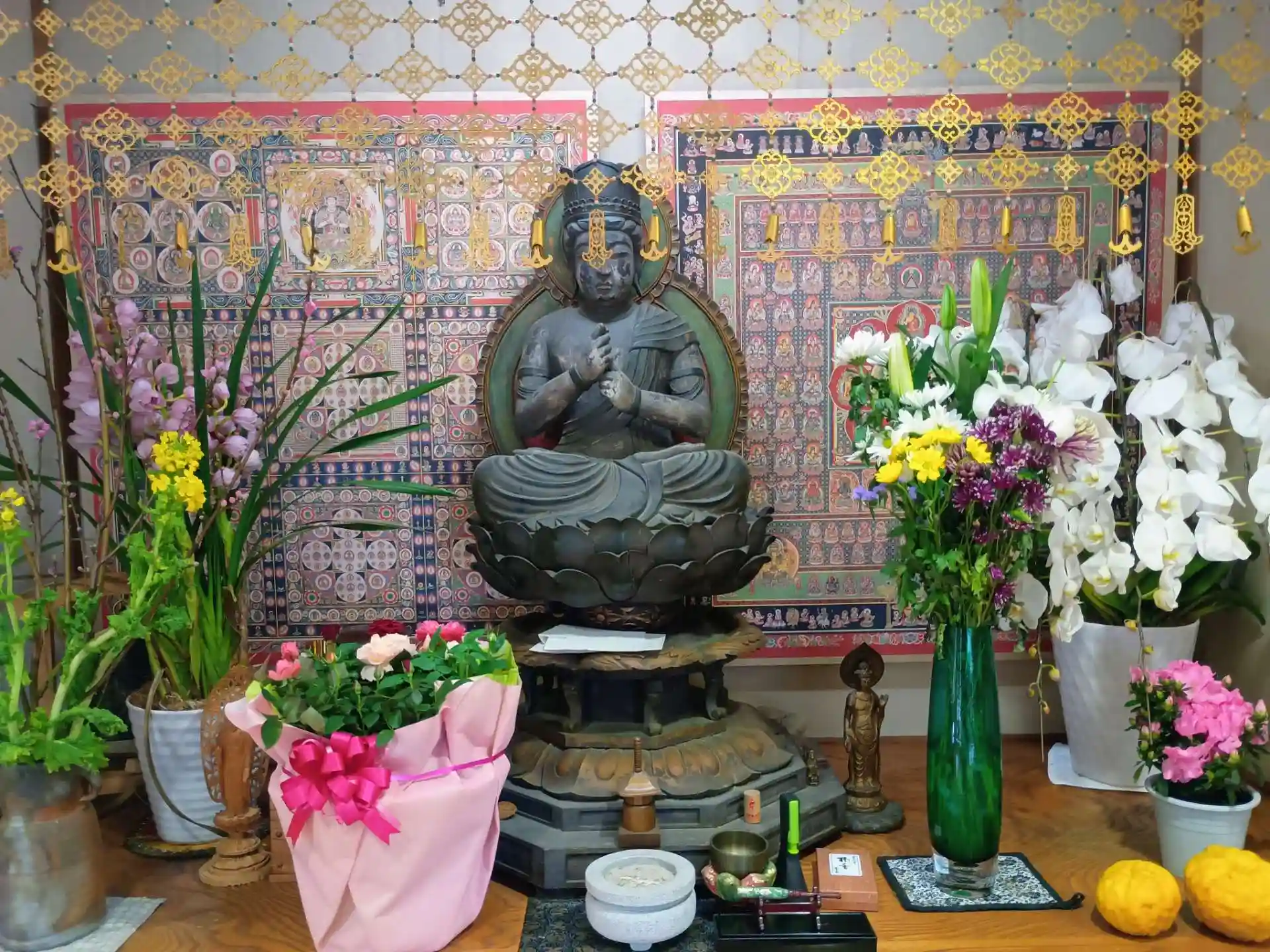 住宅街の中にあり閑静な寺院。曼荼羅美術館(入館料500円) は、古い歴史的な曼荼羅はありませんが現代の仏画画家が描いた曼荼羅があり緻密で色彩豊かで美しく魅了されます。御朱印は書置きのものをいただきました。