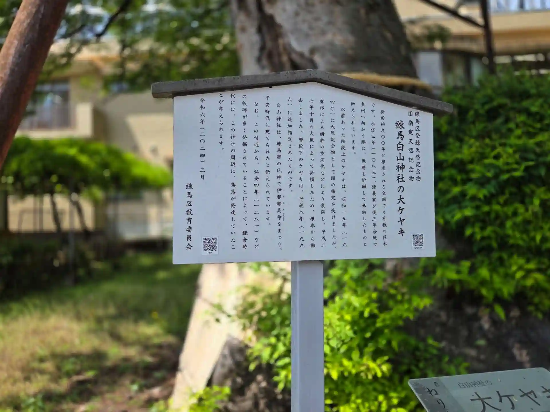 御神木の大ケヤキ(区、国天然記念物)永保三年(1083)、後三年の役の際源義家奉納と伝わっています