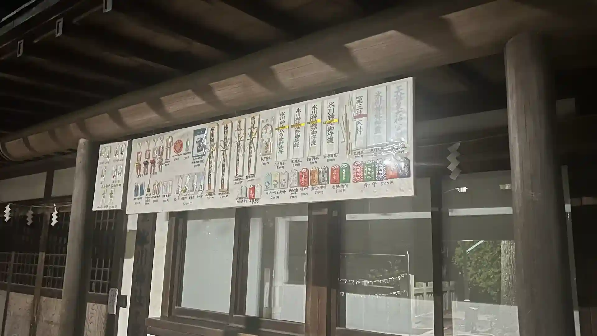 拝殿右手には神楽殿があり、祭礼時にはここで舞が奉納されるのでしょう。左手には社務所が建ち、御守やお札などの授与品が豊富にそろっています。特にキティ御守りなどの親しみやすい授与品もあり、窓口が開いている時間帯に限り授与されているようです。境内をさらに奥へと進むと、いくつかの境内社が鎮座しています。一番左には辨天社、その右隣に二つの小祠が並び、左が白山神社、右の社は詳細不明です。さらにその右側に稲荷神社、最も右には御嶽神社が鎮まります。それぞれが異なる神格を祀りながらも、全体として調和のとれた配置となっており、境内を歩くだけでも地域信仰の広がりと深さを感じさせます。