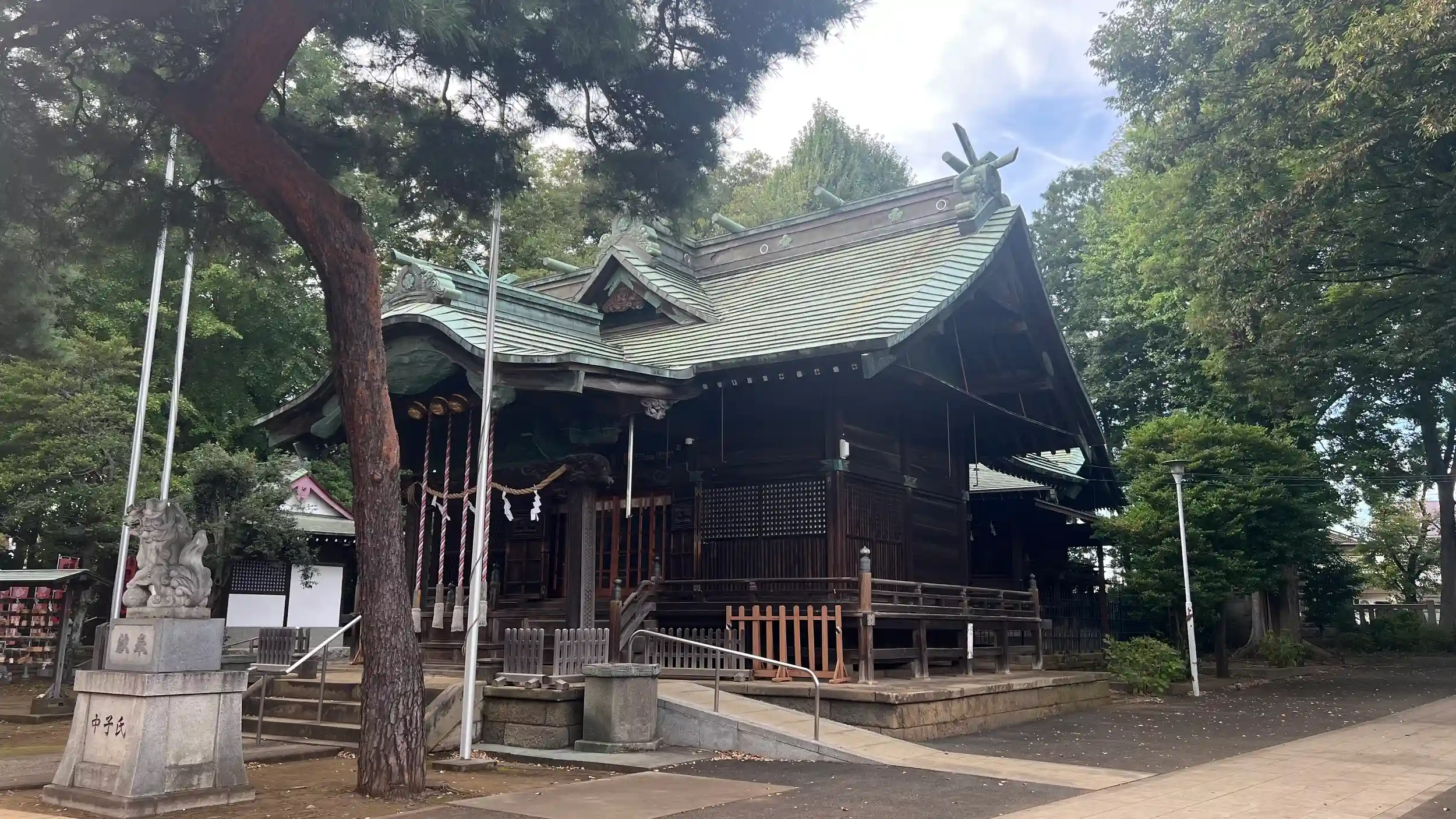 参道を進むと、両側に石灯籠と狛犬が控えています。どちらも風雨にさらされ、苔むした姿ながら堂々たる風格を保っています。やがて見えてくる拝殿は、銅板葺の屋根が年月を経て美しい緑青色に変わり、落ち着いた趣を漂わせています。拝殿の右側には社務所と神楽殿、そして左側には太鼓庫屋が整然と並び、地域の祭礼が今も大切に受け継がれていることを感じさせます。境内社としては、稲荷神社と御嶽神社の二社が祀られており、地域の多様な信仰が共存していることがうかがえます。