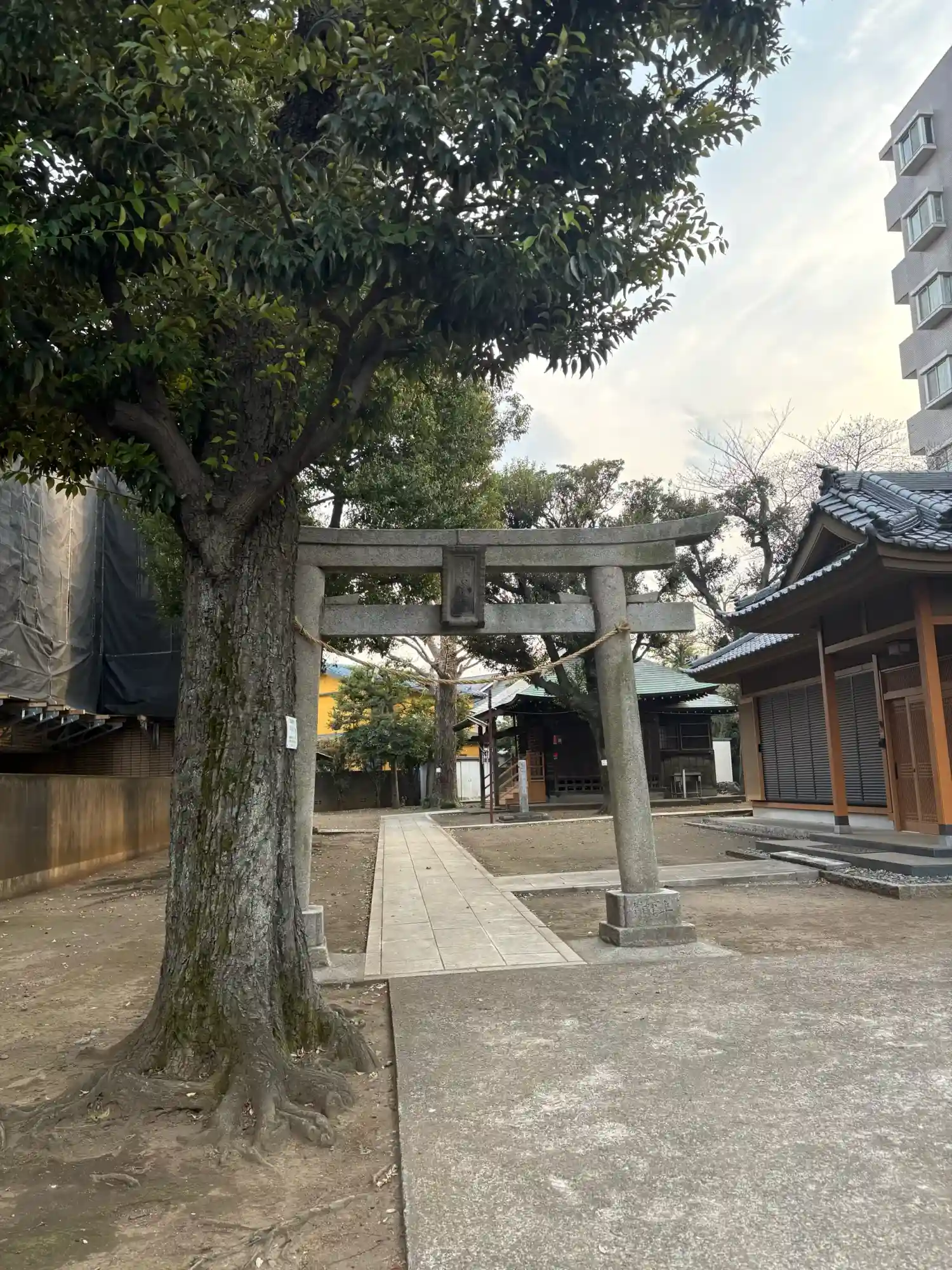 こちらのお稲荷さんの境内は二棟のマンションに取り囲まれている。そのマンションとほぼ同じ高さにまで成長した木々が、境内には数本そびえている。銀杏、スダジイ、クスノキである。スダジイの樹皮は苔に覆われていた。かつて青梅街道を行き交った商人や行商人を、長く見守ってきたのだろう。これらの木は御神木として祀られているわけではないようだが、朽ちることのないよう手入れが行き届いている。練馬区設置の保護樹林を示す標識も付けられている。数百年にわたり、近郷近在の参拝者を静かに見守ってきたに違いない。境内には、早くも落ちた銀杏の葉が一枚。まだ緑色を保っているが、そこにも秋の兆しが感じられた。
