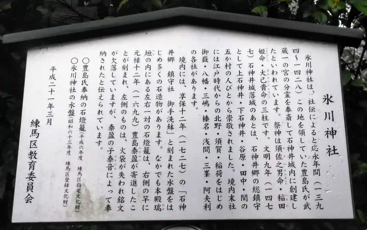 | ご由緒 | この石神井・氷川神社は石神井の郷の総鎮守社です。現在の町名では、石神井台から石神井町、上石神井、下石神井、立野町までを含む全域の鎮守(守り神)です。かつてはこの地域は、谷原・田中・上石神井・下石神井・関、の五つの村からなっていました。本社はその各村民より、長きに渡りあつい崇敬を受けてきた神社なのです。今日なお、一般に「石神井のお氷川さま」と呼ばれ、親しまれています。氷川神社が石神井郷の総鎮守であったことは、『新編武蔵風土記稿』や『江戸名所図会』などの諸本に、その社名が明記されていることからもわかります。また現存する御手洗い鉢(社殿の西側、末社の前にある石造りの鉢)にも、「石神井郷鎮守社」と刻まれています。