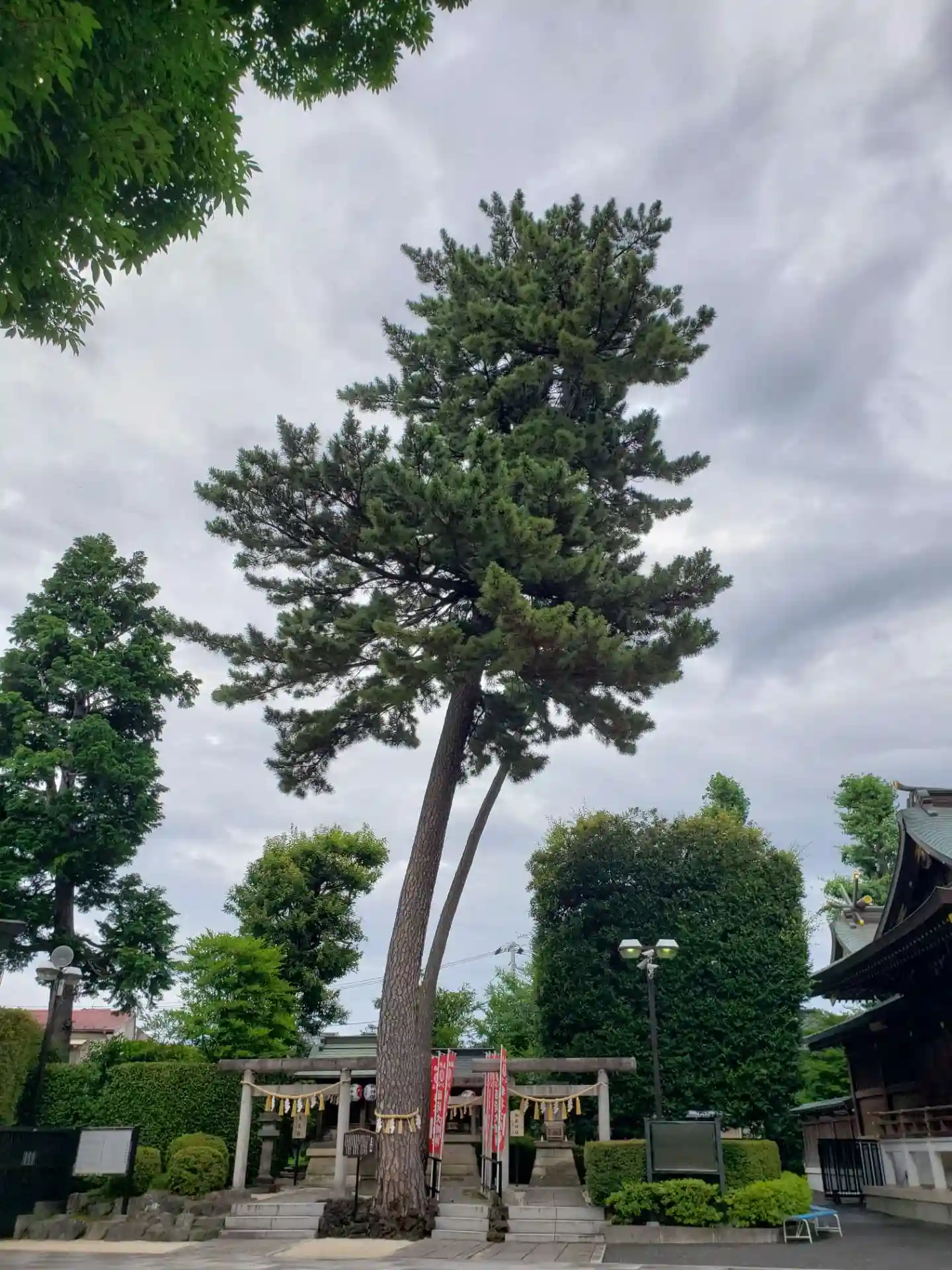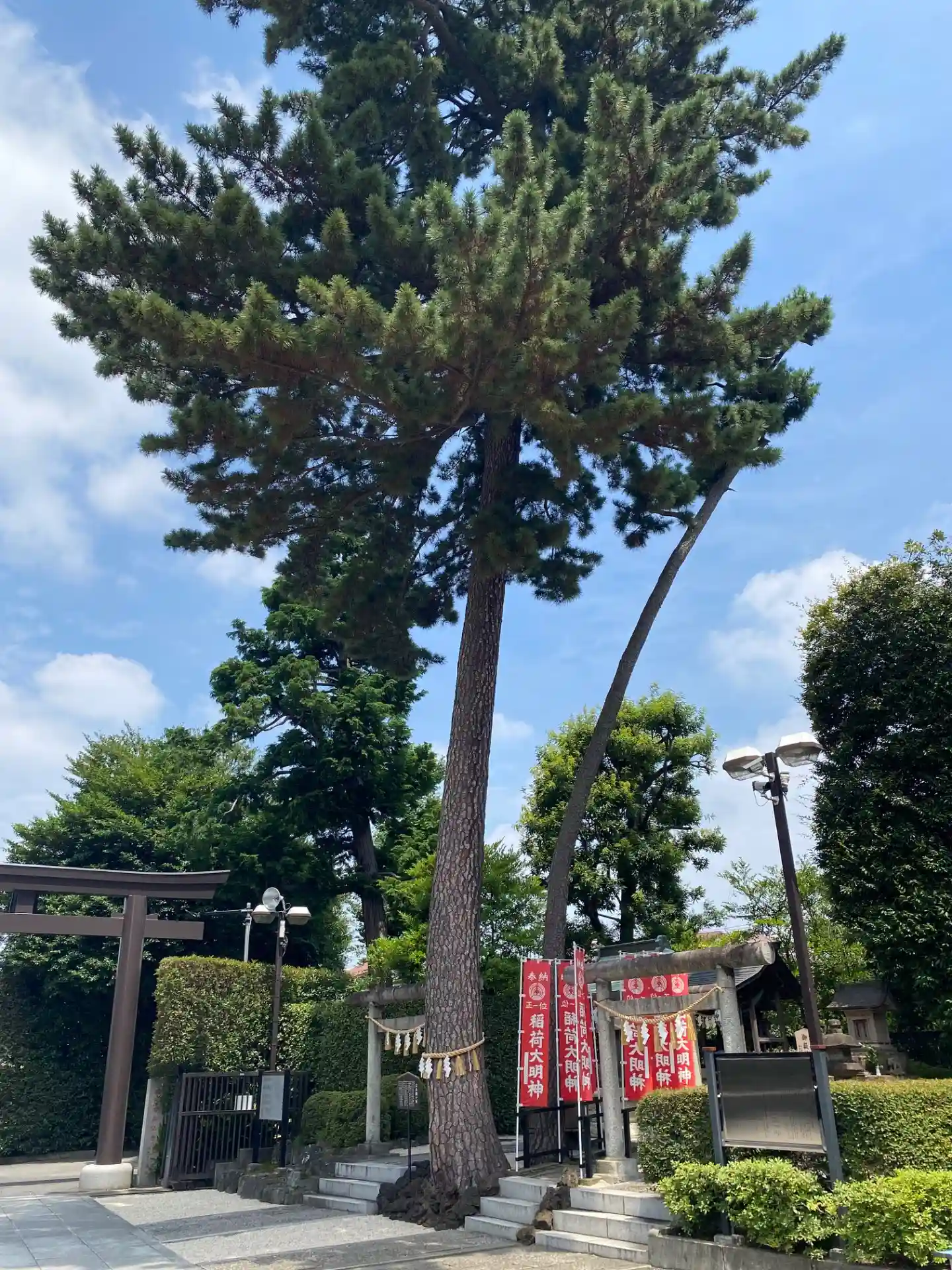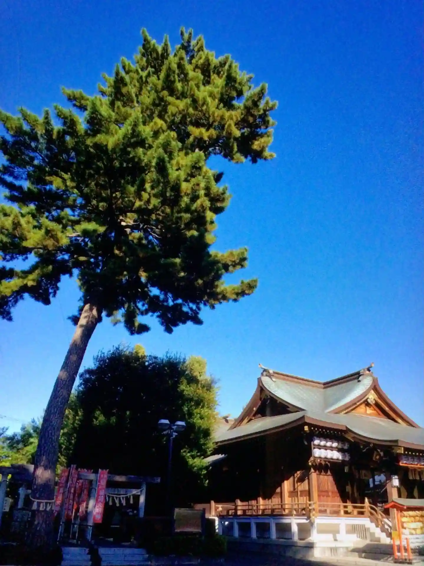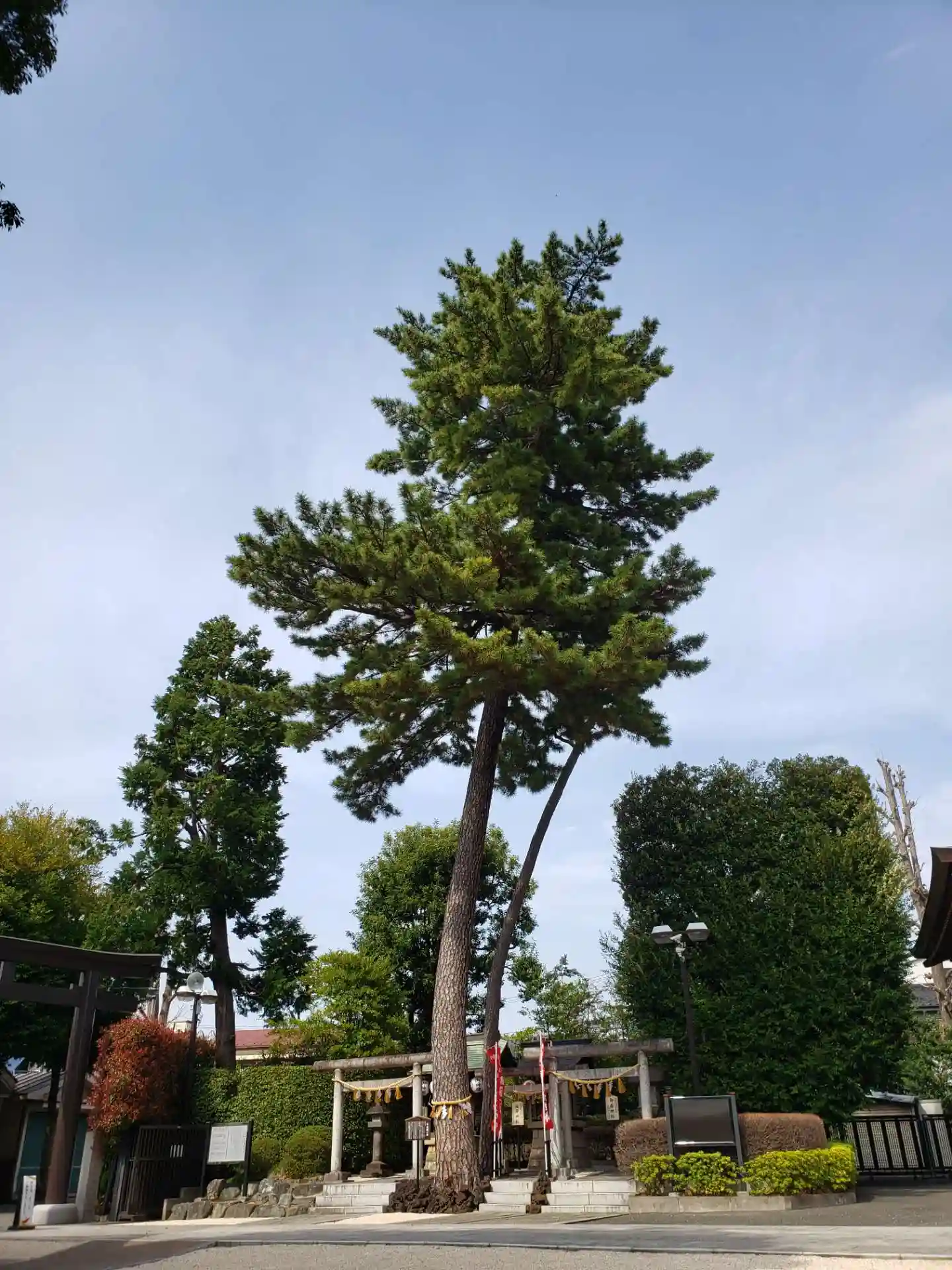 幸せを呼ぶ三本願い松がある沼袋神社へ。青い空に松がそびえていました。七福神も祀る静かな神社です。