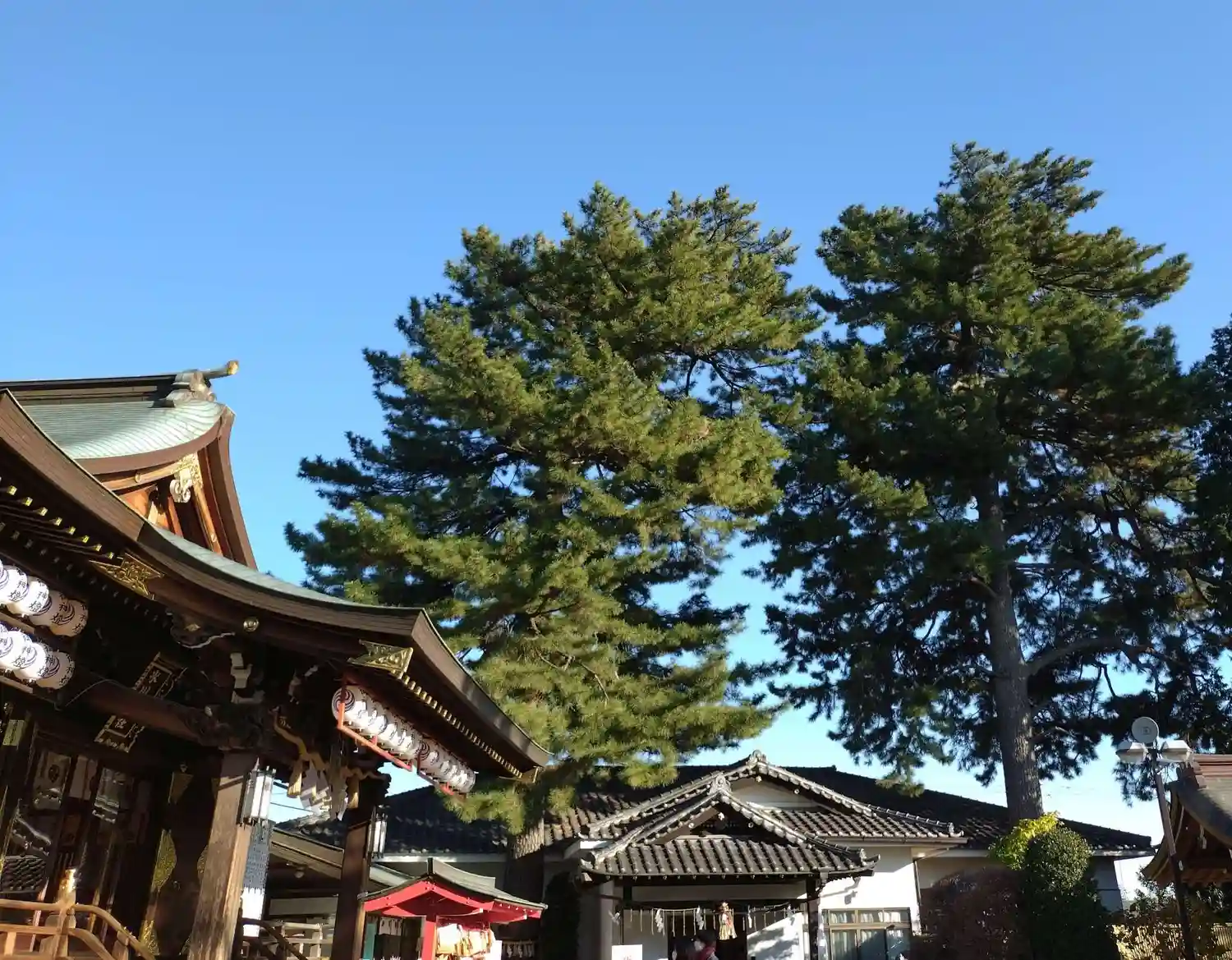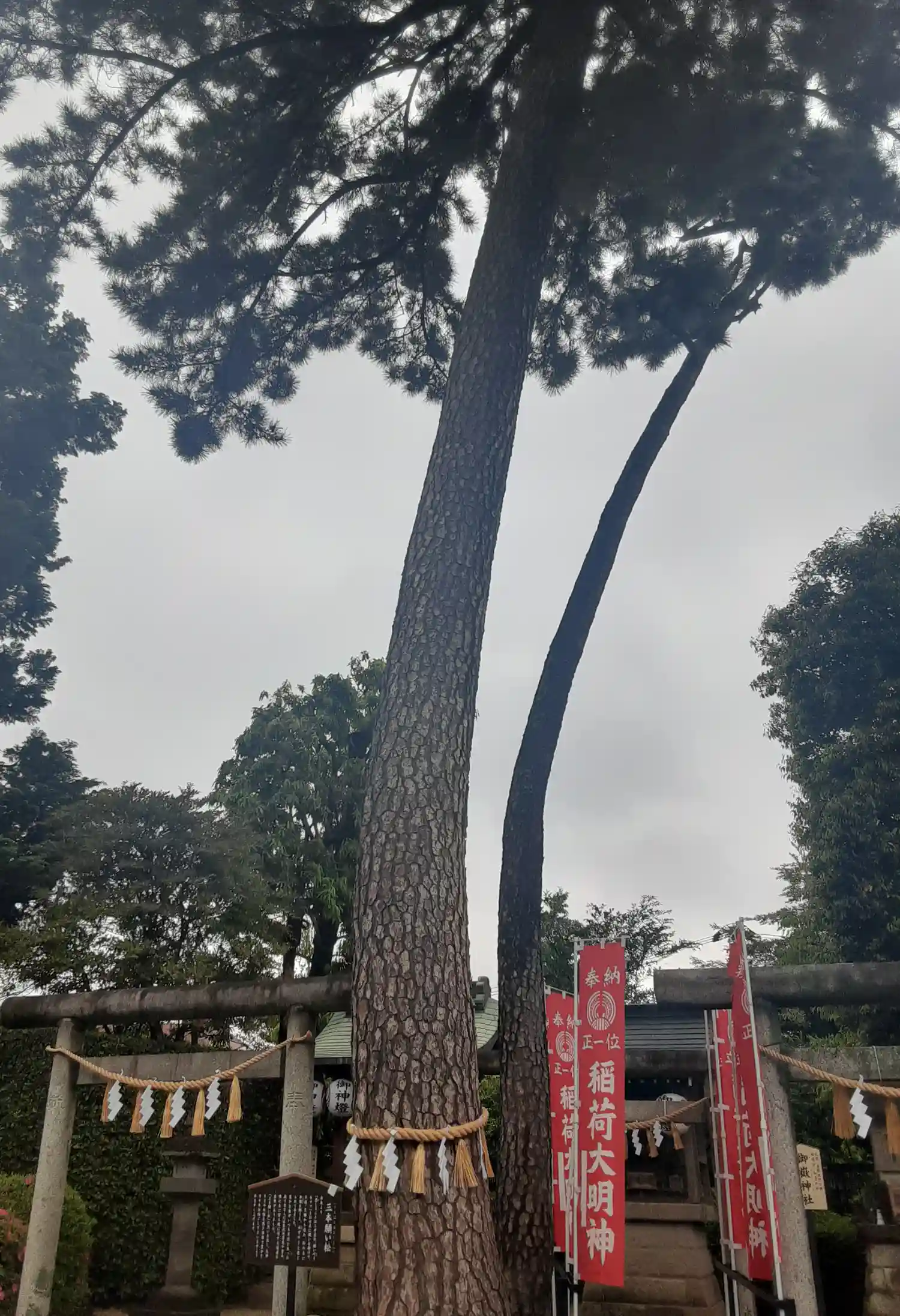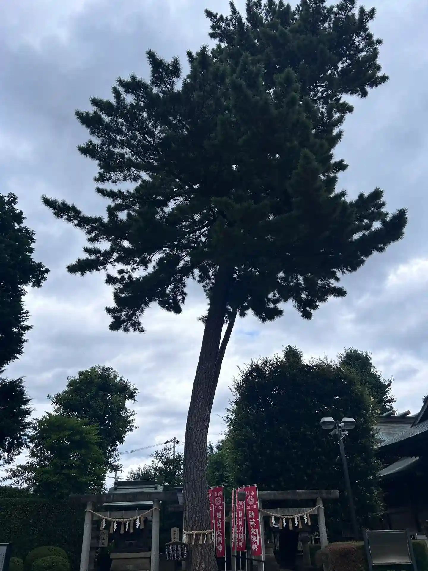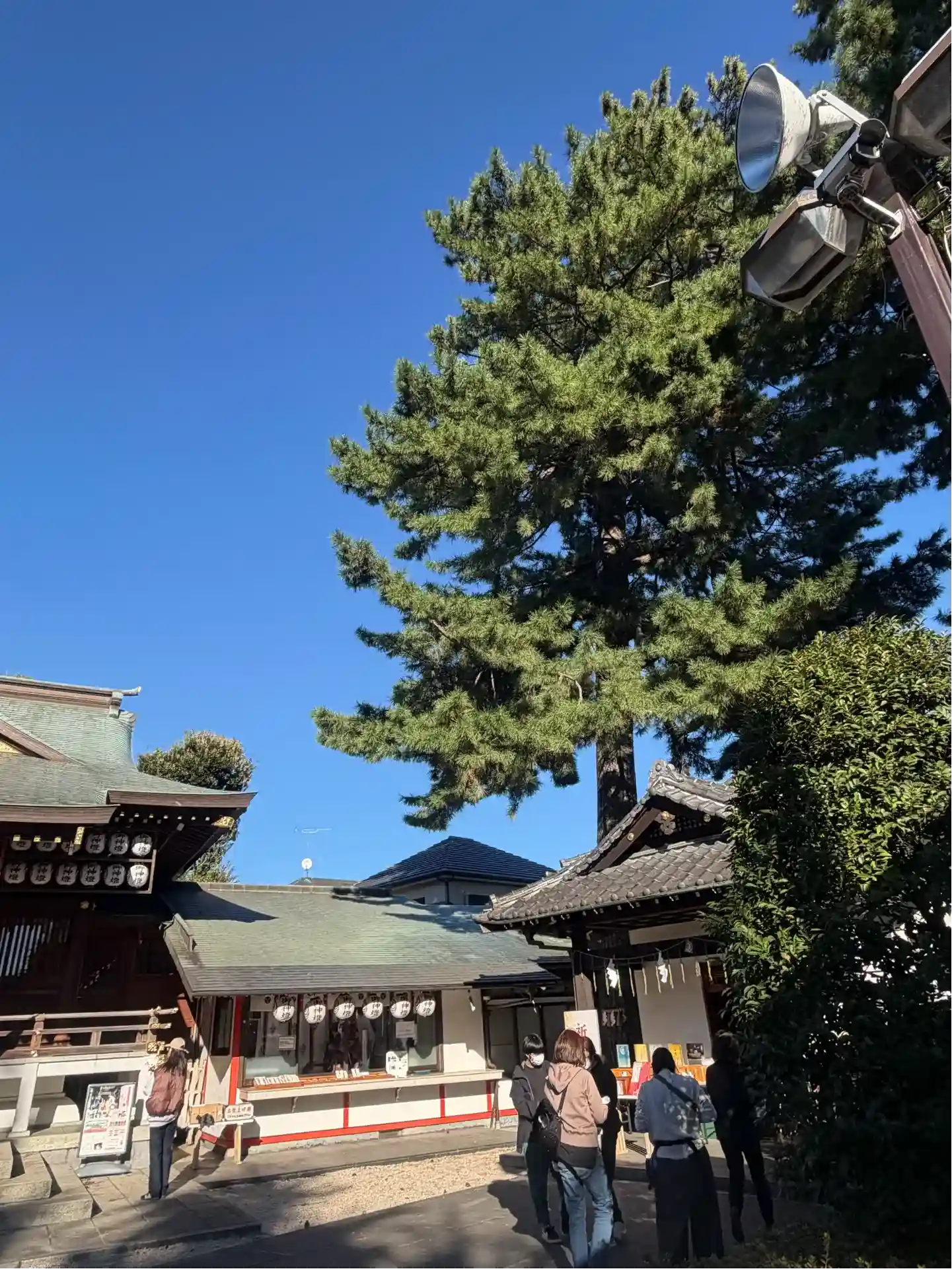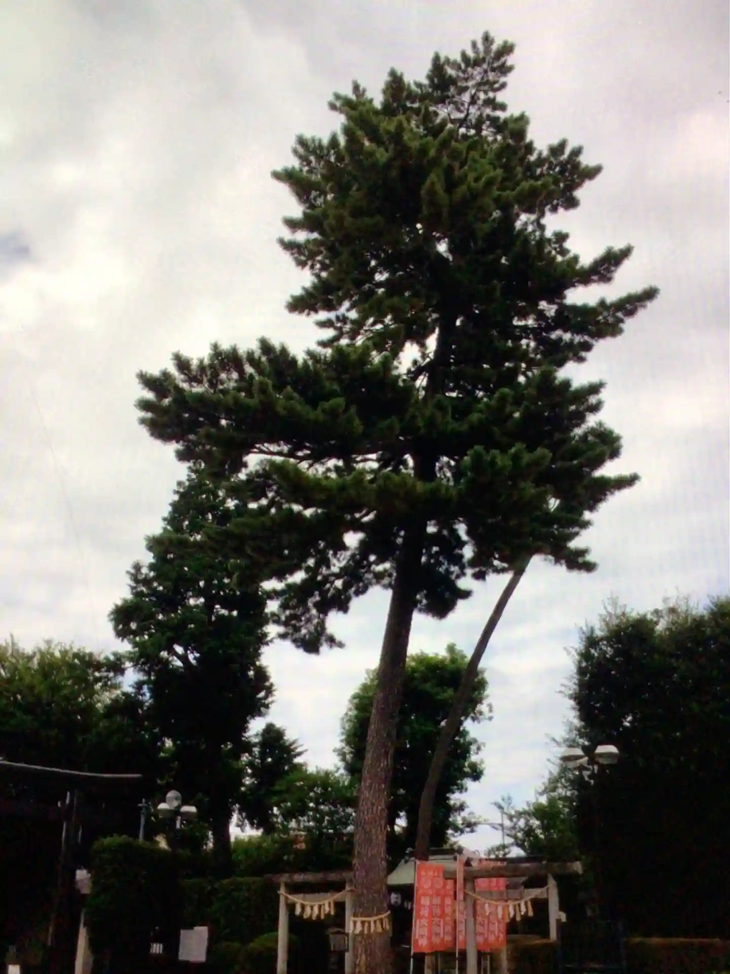 幸せを呼ぶ三本願い松がある沼袋神社へ。青い空に松がそびえていました。七福神も祀る静かな神社です。