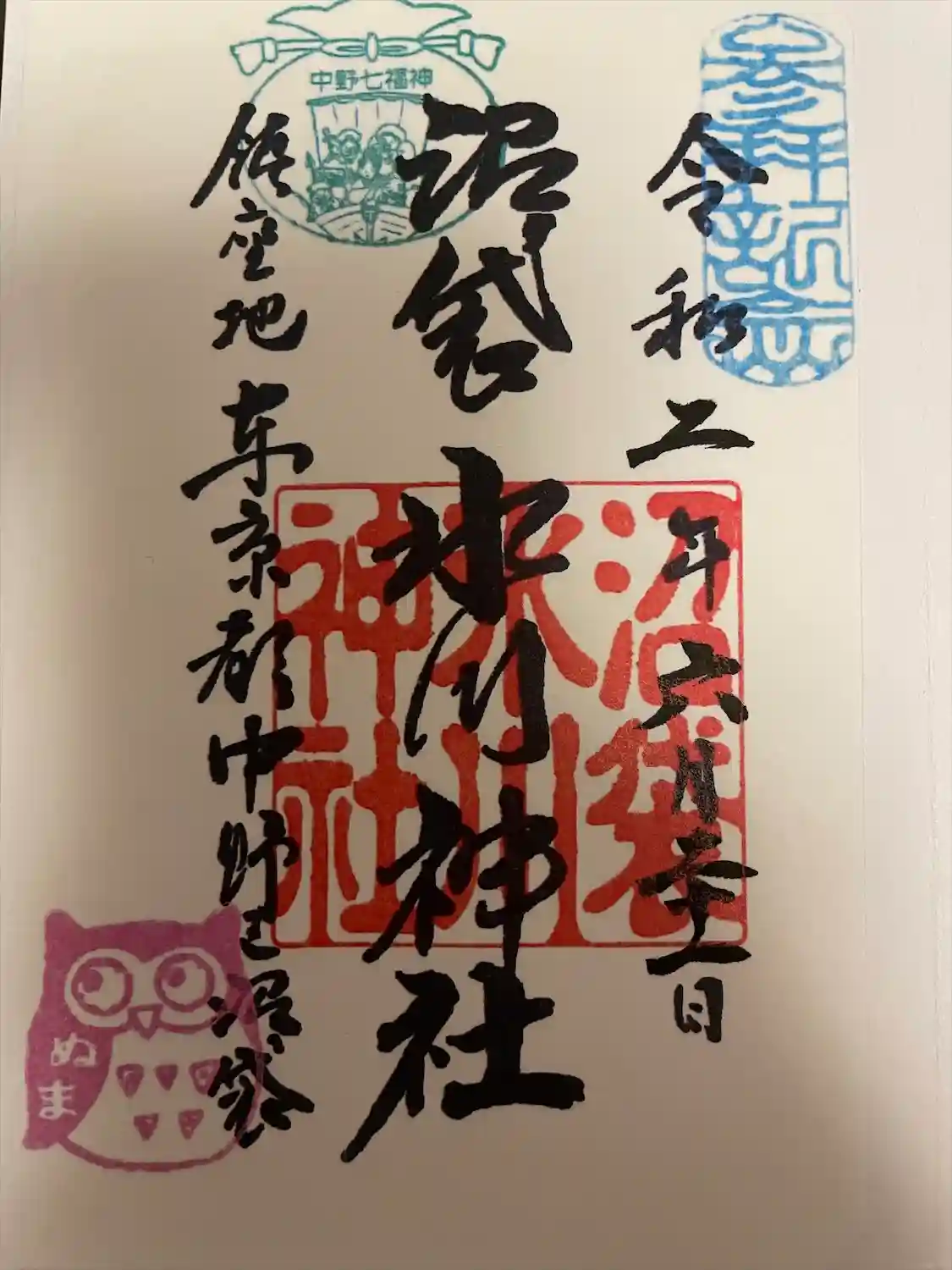 北野神社から西武新宿線を渡り、徒歩7分です。落ち着いた神社です。七福神の御朱印もいただきました。