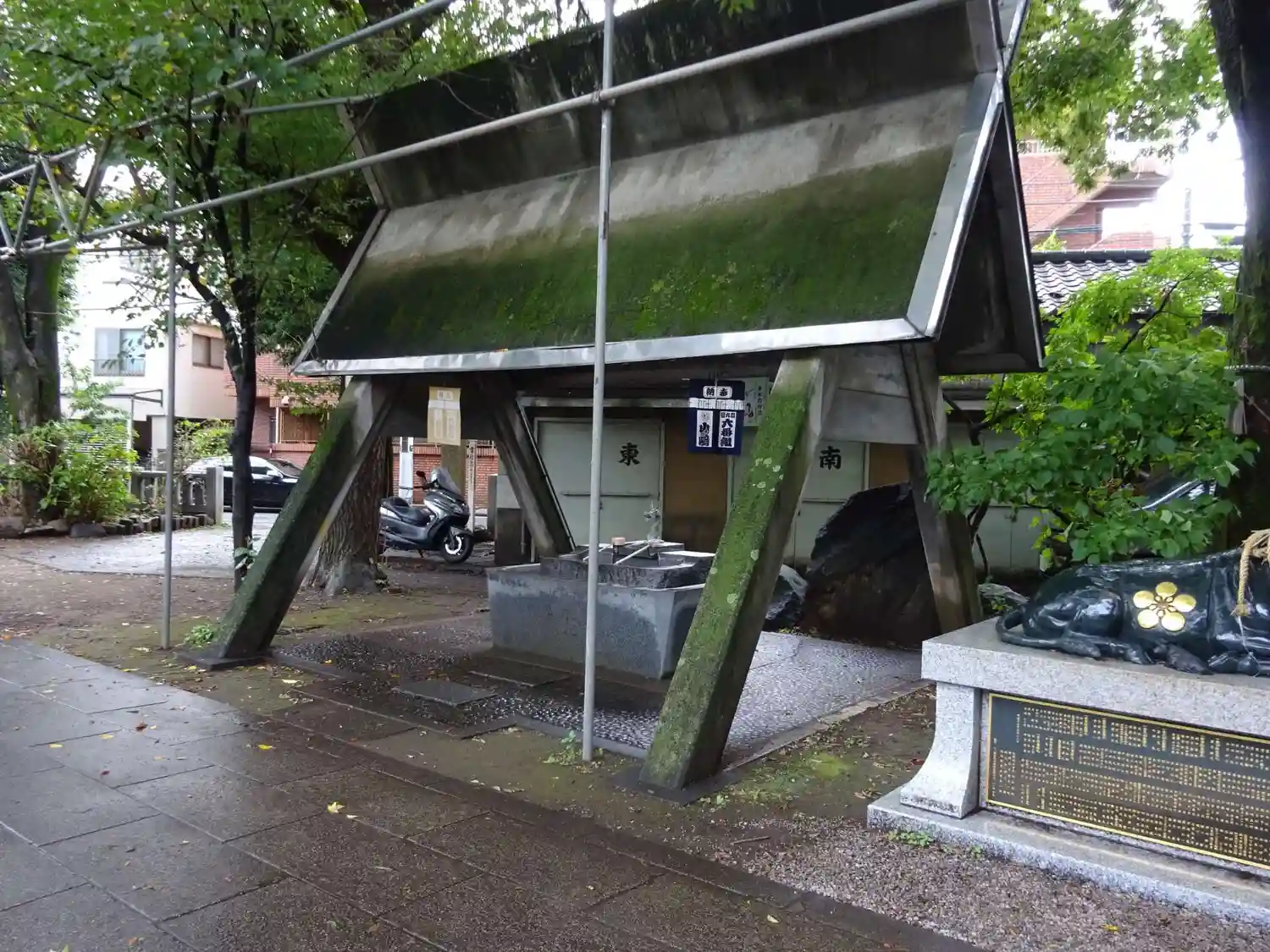 手水舎の三角形の屋根が特徴的です。 穏やかな表情の子育て狛犬にほっこりします。
