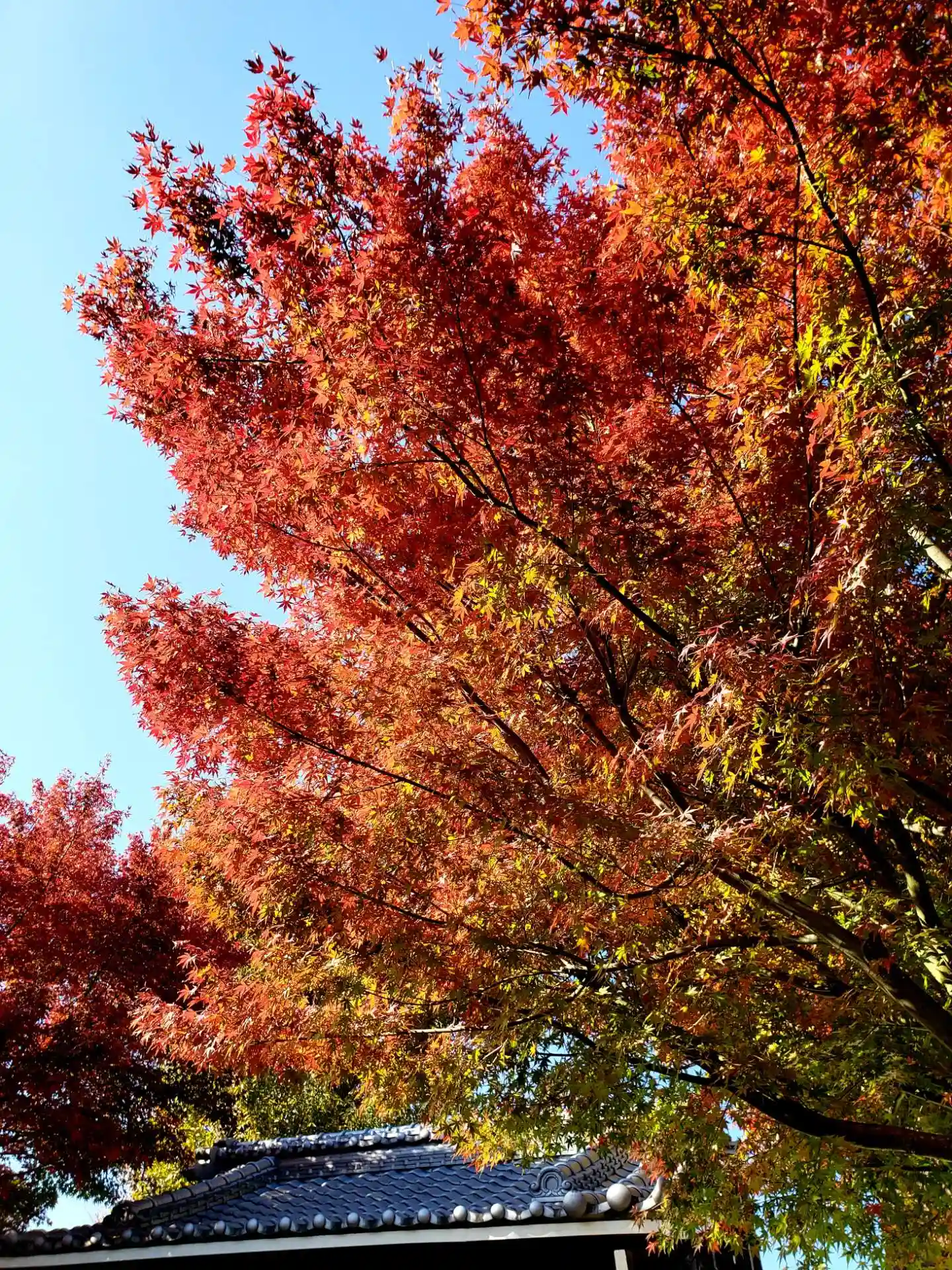 思っていた通り、とても綺麗な紅葉を楽しめました。昨年は、銀杏が終わっていたのですが、今年は赤と黄色と…金剛寺の先から入ると横手からになり、お参りを済ませて、境内から山門を出ると、高い位置になり、緩やかな石段と石畳を降りながら振り向くと良い景色です。