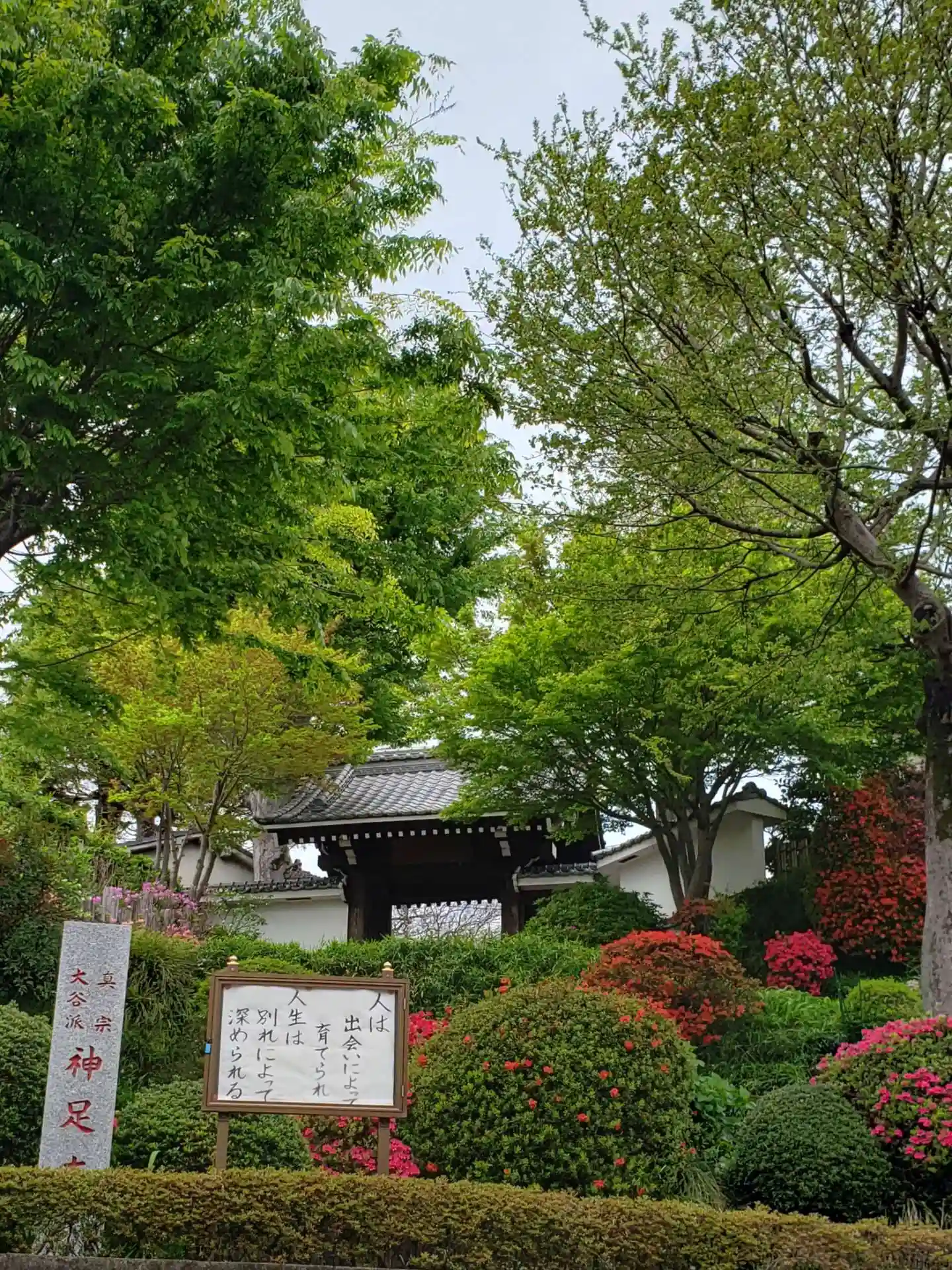 開花に時差があるのと、敷地の広い庭園とは違いますが、山門からの石畳沿いのツツジは、なかなか素敵な景観です。