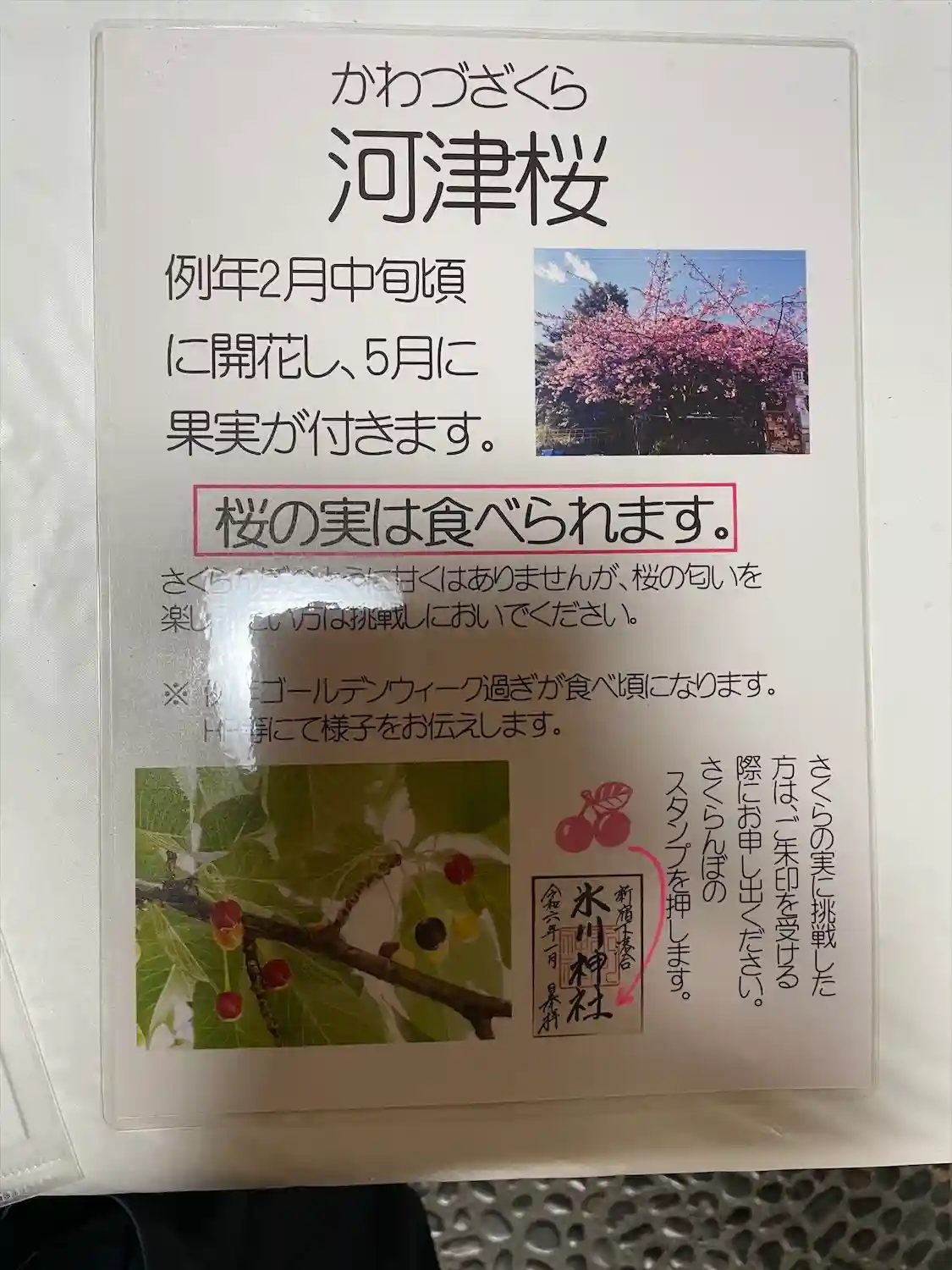 社務所で河津桜は実がなるので時期になったら食べて見てくださいとのこと。知らなかった😳御朱印にさくらんぼのスタンプを押してくださるそうですよ🍒