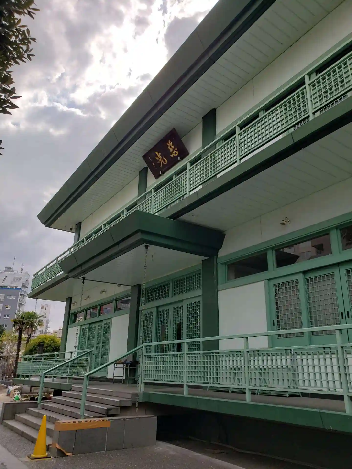 入口外の左右に観音様があり、本堂は薄い緑が印象に残るコンクリートの建物です。