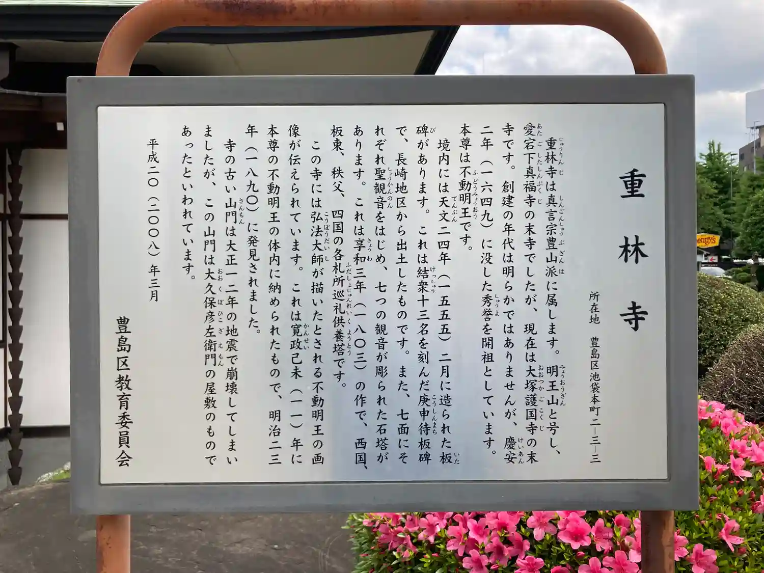 池袋四丁目バス停(池袋行き)目の前の重林寺にお参りしました。とても広い境内で山門前が首都高高架とは…
