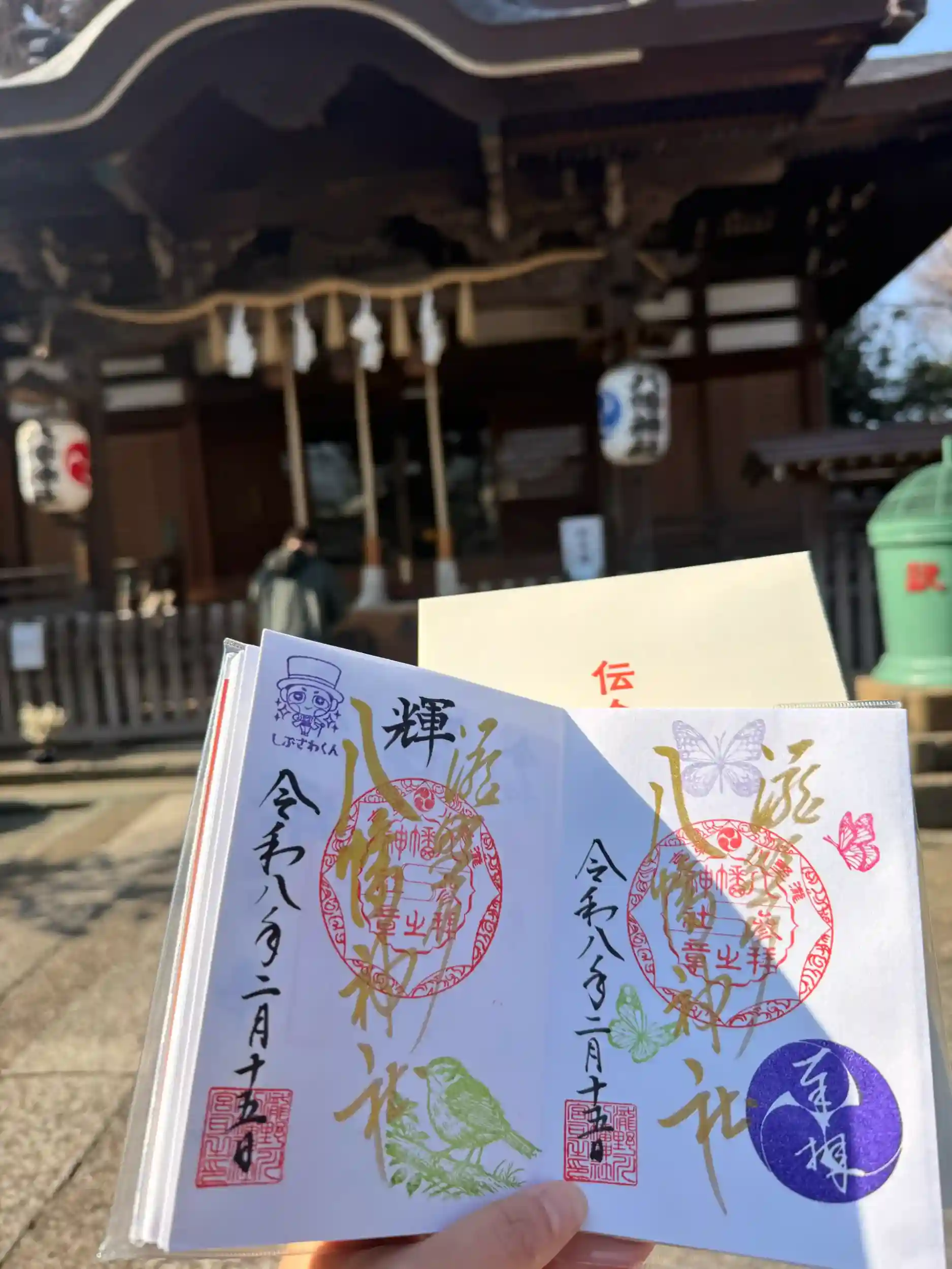 うぶすな2社巡りと月例祭の御朱印頂きにお参り。輝の文字を入れてもらいました。渋沢くんスタンプも笑