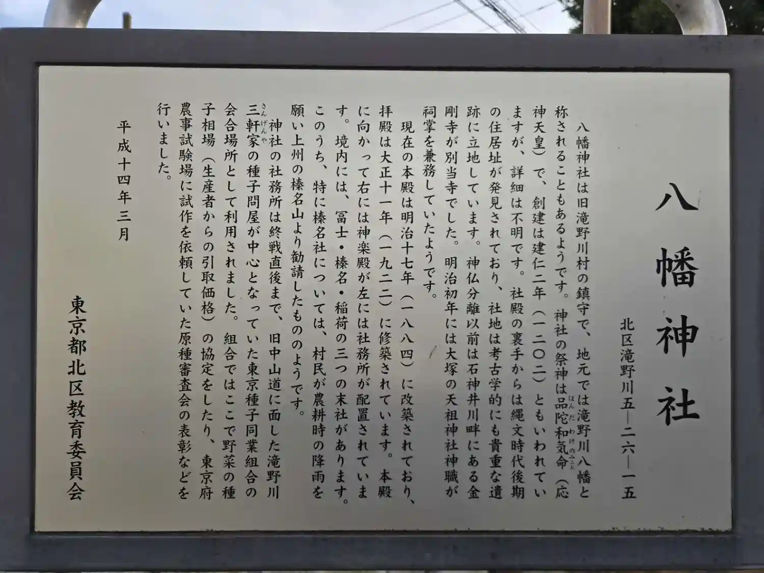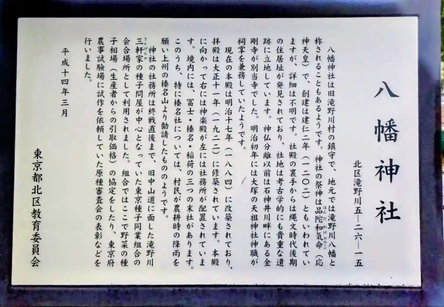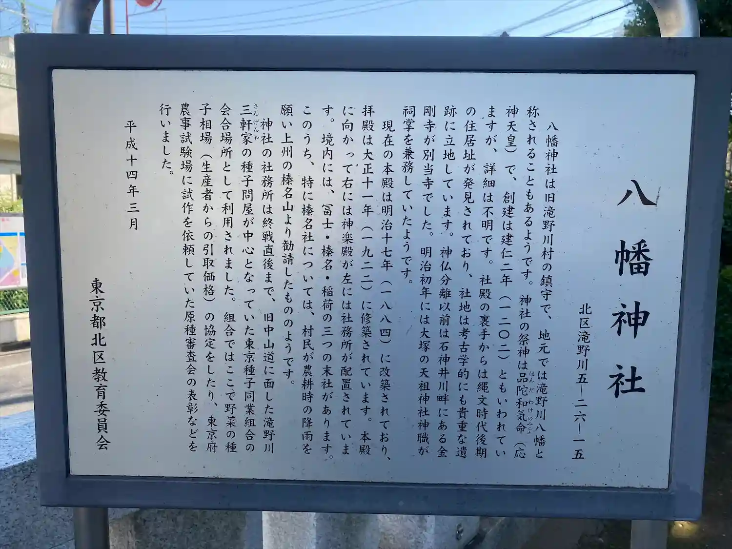 北区滝野川にある村社格の神社。主祭神は名品陀和氣命(第15代 応神天皇)で、創建は、鎌倉時代前期…
