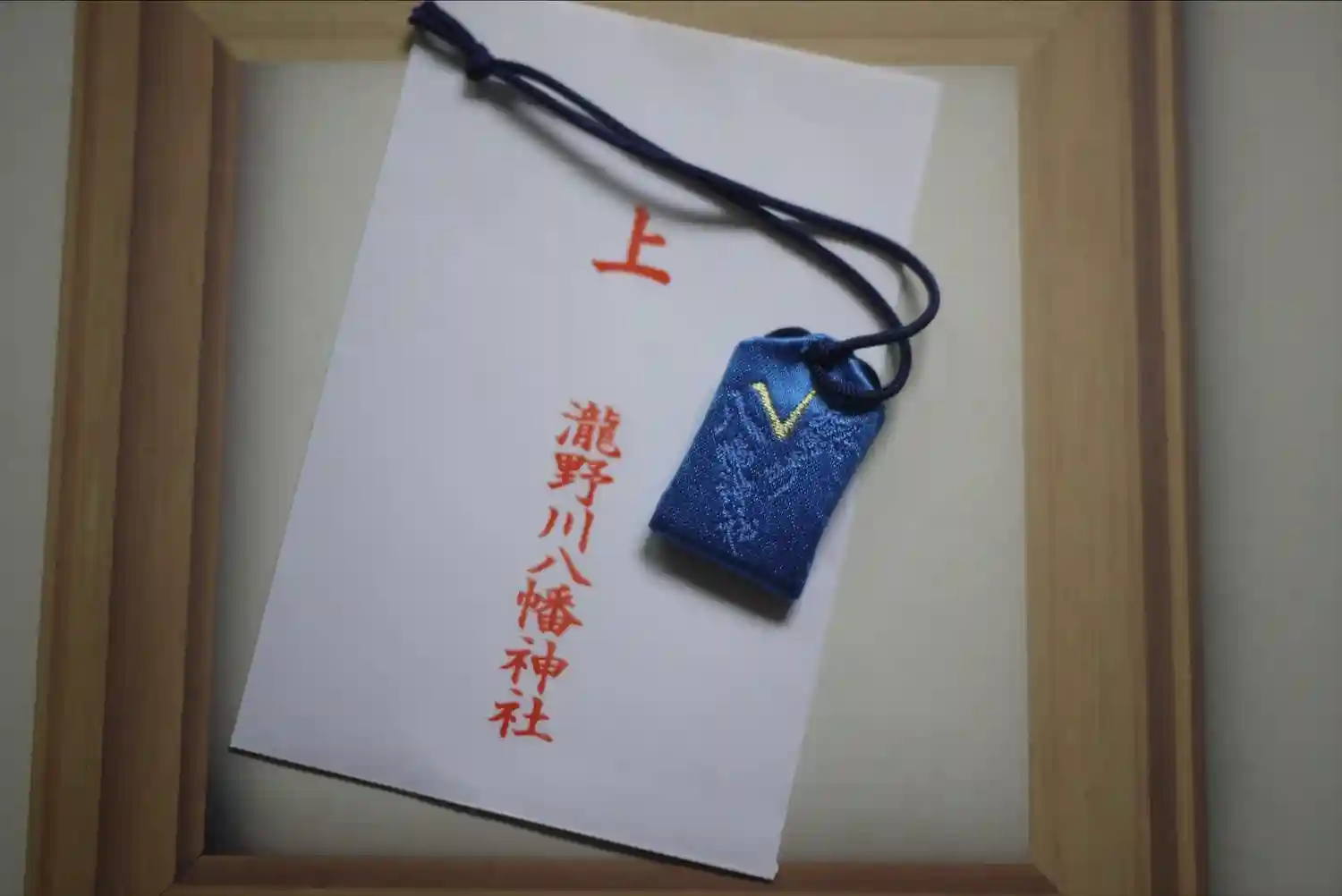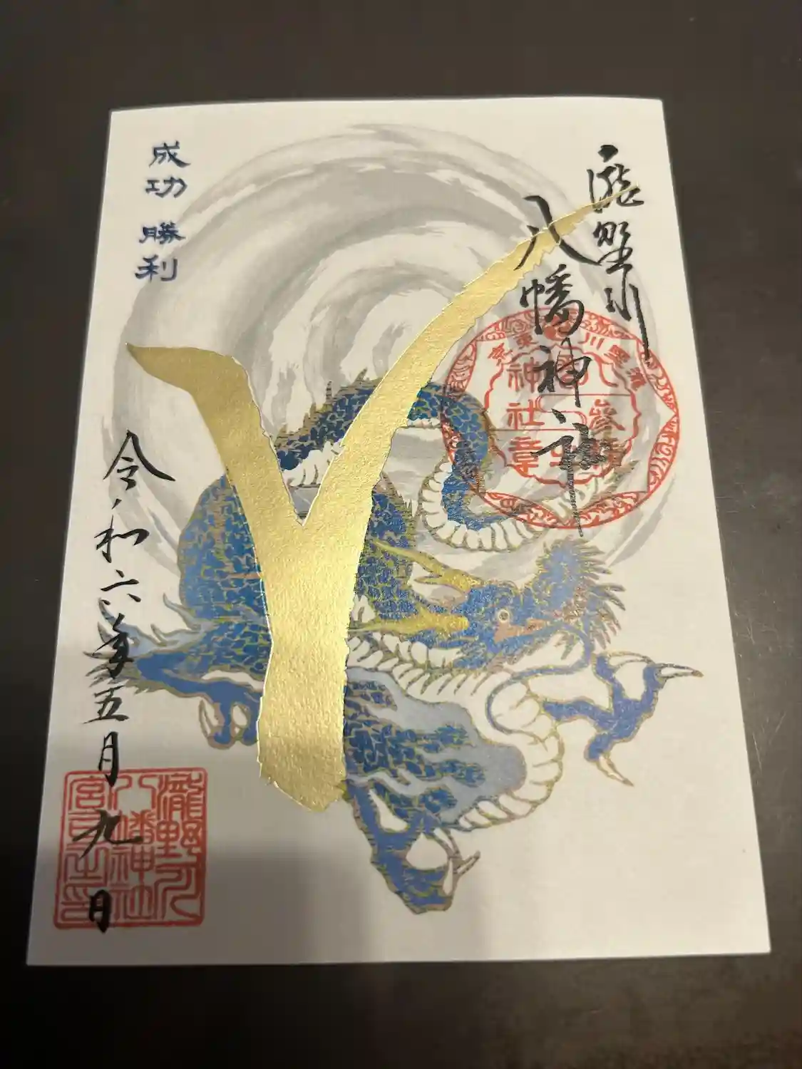 御朱印帳の青色ですが他、黄色・紫色・桃色がありました。スポーツのご利益だけあって金色のVが格好いいです👑