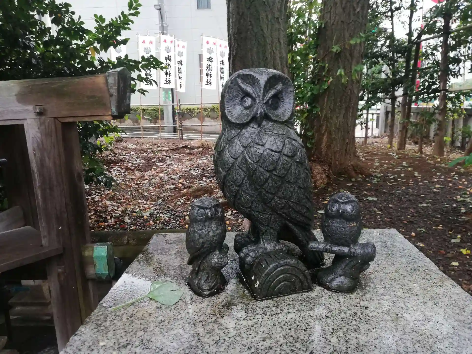 拝殿前のふくろう親子。