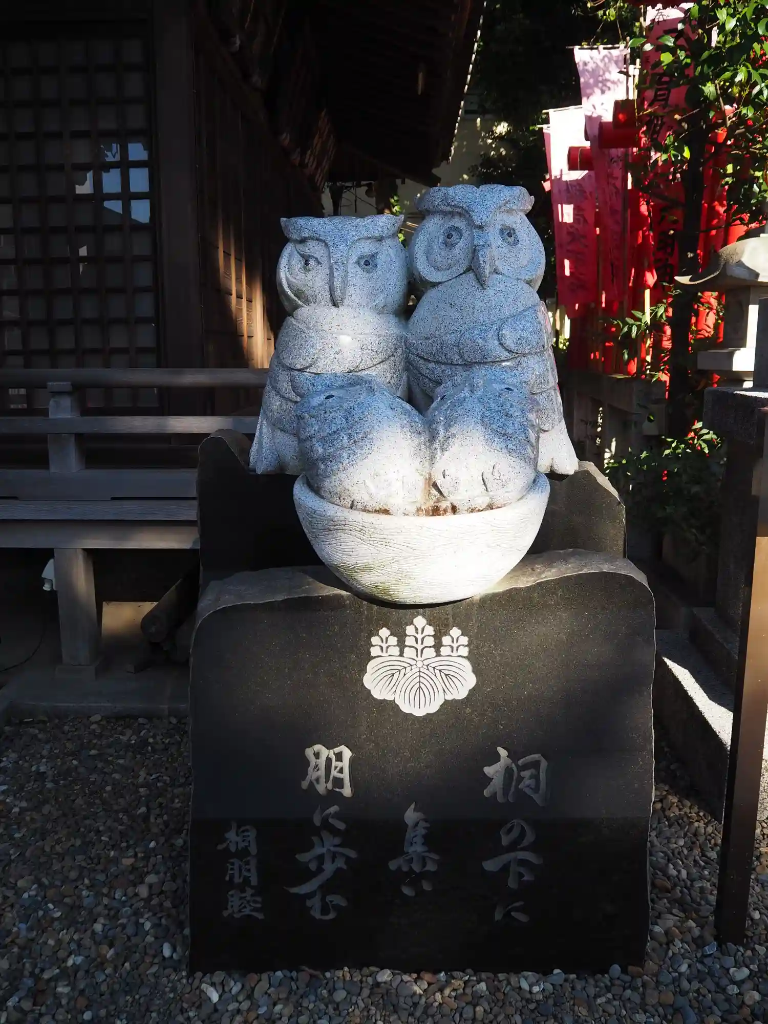 拝殿のところにあるフクロウの像の石碑に、「桐の下に集い朋に歩む」