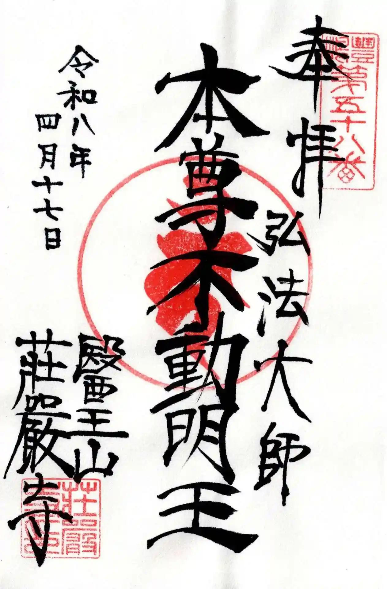 拝受した御朱印には、御本尊である「本尊不動明王」の文字が力強く、均整の取れた筆致で記されています。中央には不動明王を象徴する梵字(カーン)の宝印が鮮やかに押され、右上には「豊島霊場 第五十八番」の印が配されています。令和八年四月十七日の日付とともに、まさに「荘厳」な空気を纏った御朱印を手にし、美しい牡丹の風景を胸に刻む穏やかな参拝となりました。