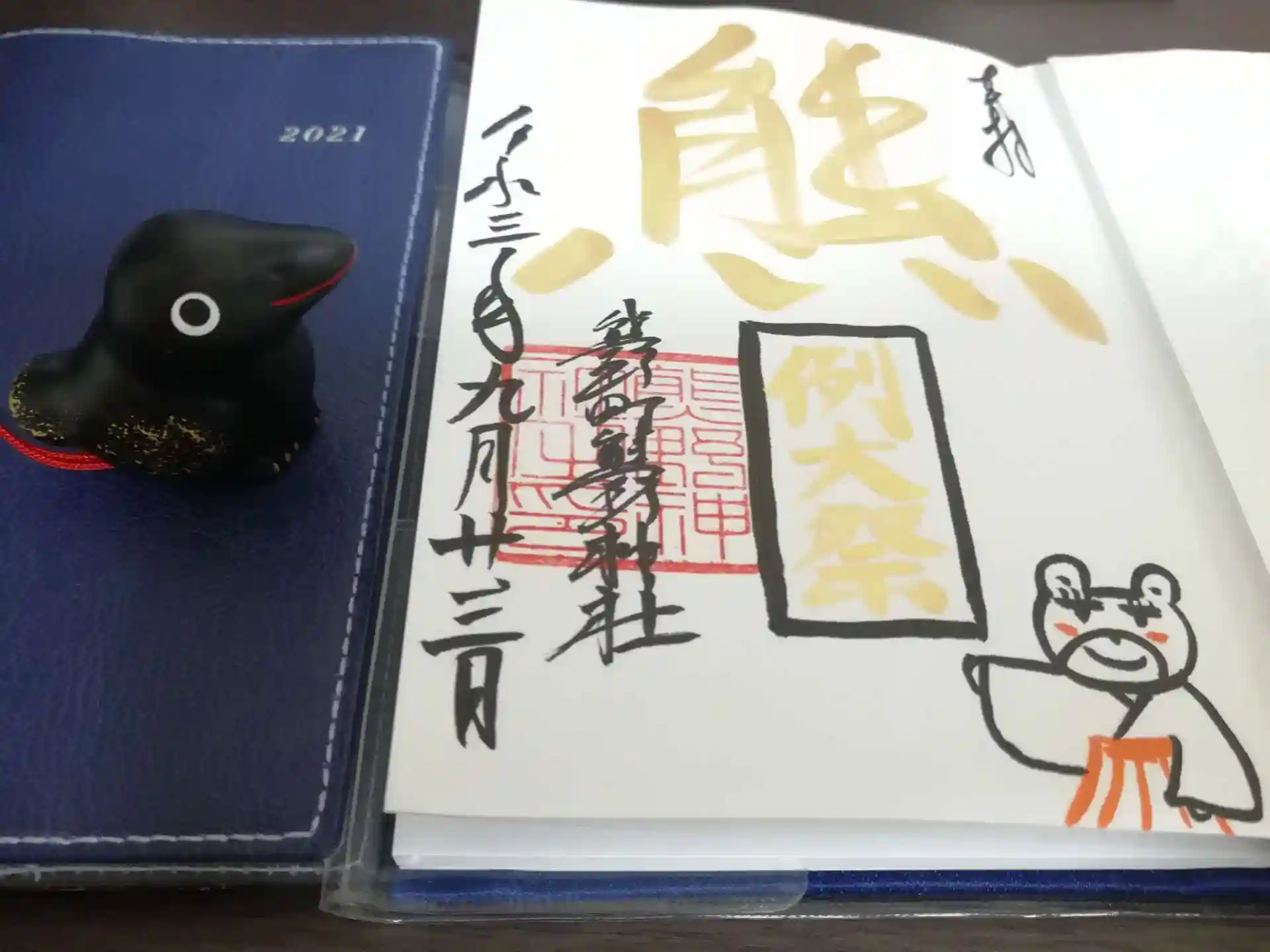お参りの後、社務所で御朱印と、カラスさんもいただいてきました。カラスさんはたくさんいる中から選ばせていただけます。お腹の中におみくじが入っています。
