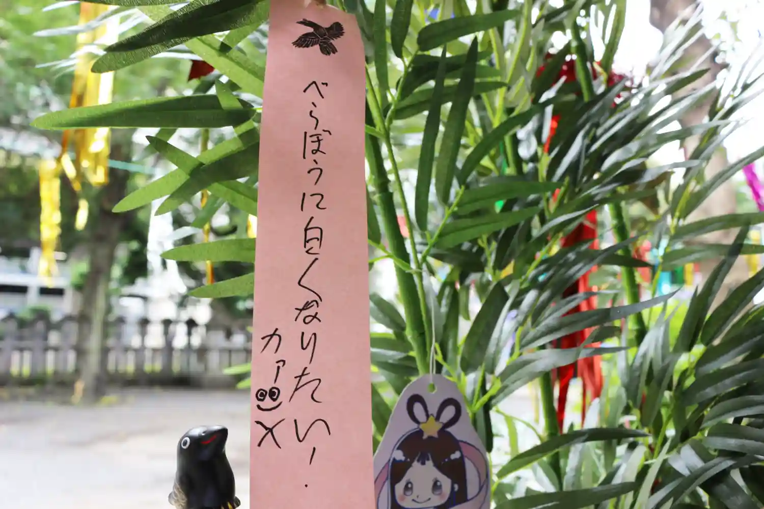 お願い事を書いて誇らしげなカラス