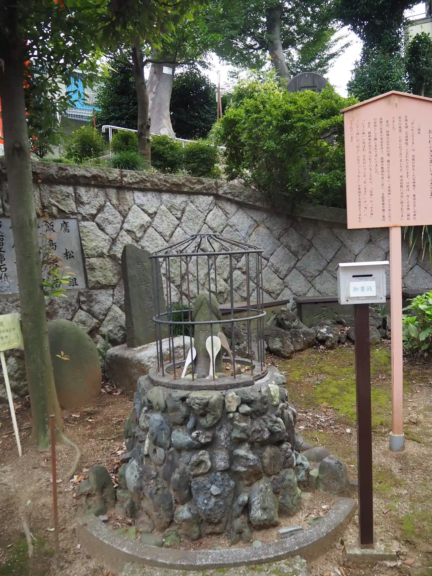 境内社おしわぶきさま-境内説明看板によりますと、男根の形をした石神様で、かつては別な場所に、村の道の安全を守り、疫病や悪神を追い祓い、五穀豊穣を願う道祖神として祀られていたが、明治初期にこの地に遷されたとのことです。