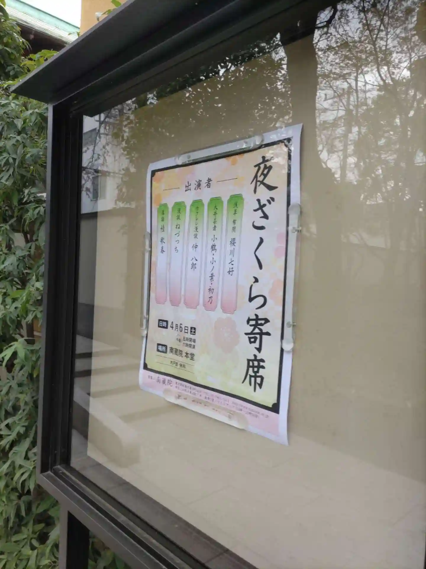 裏口掲示板に夜桜寄席案内。