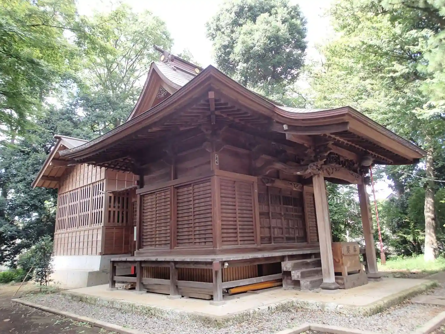 <拝殿>全景。由緒書きによると社殿は100年おきに改修されているようで、江戸時代後期の1815年、明治時代の1919年、平成の2012年に改修されたとのこと。