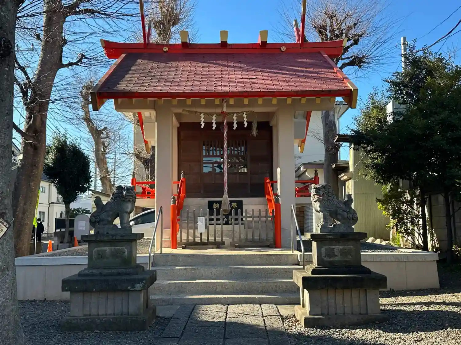 社殿はコンクリート造りで、見た目にも非常に頑丈な印象を受けます。風雨に晒されてもびくともしないような安心感があり、現代的な造りでありながら、神社としての落ち着いた雰囲気をしっかりと保っています。特に屋根の朱色が鮮やかで、周囲の緑や住宅の間に映えています。この朱色が、どこか信仰の温かみや生命力を象徴しているようにも感じられます。