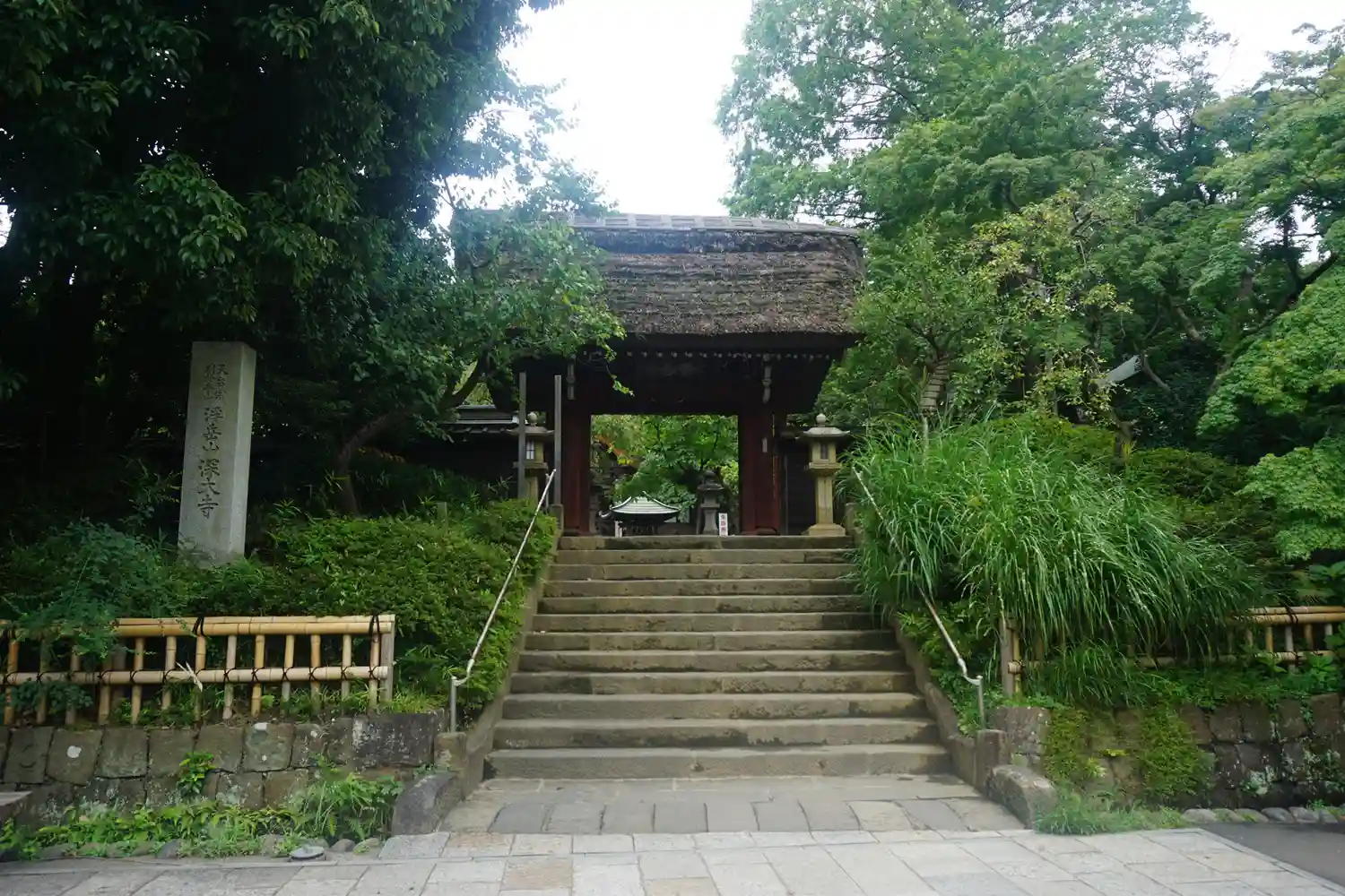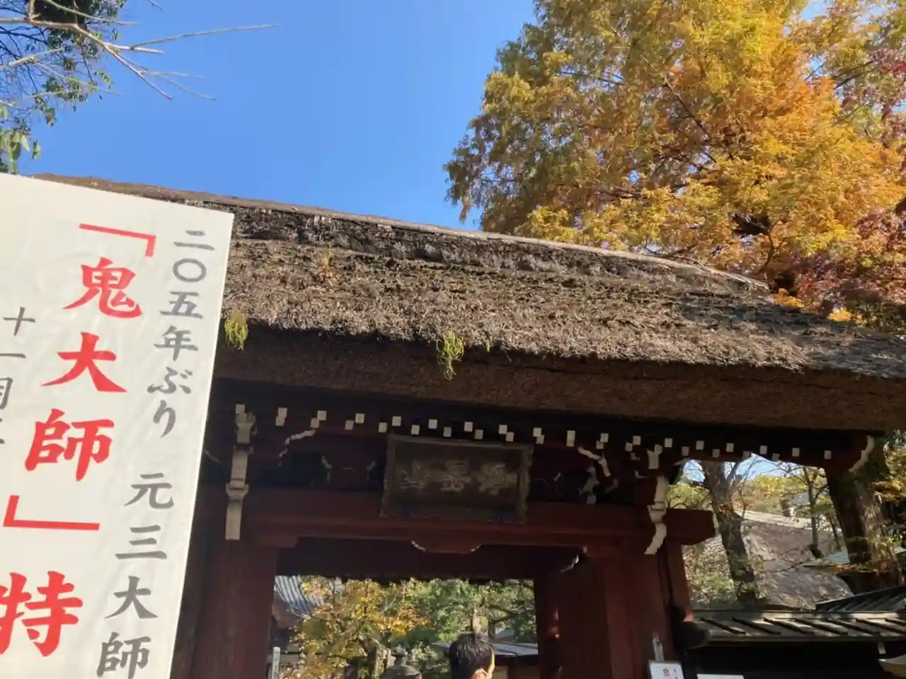 境内の南側中央にある<山門>。一間薬医門、切妻造、茅葺。1695年建立。<浮岳山>の扁額。 (注)写真左側の看板にある元三大師像の特別開帳はコロナで実現せず、2021年秋に上野の東京国立博物館にて、205年ぶりに出張開帳されるとのこと。