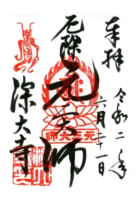 真ん中に厄除元三大師と書かれ、左上に角大師の印、真ん中に元三大師と書かれた蓮華座に梵字(阿弥陀如来)の火炎宝珠印、左下に深大寺の文字、深大寺印が押されています。