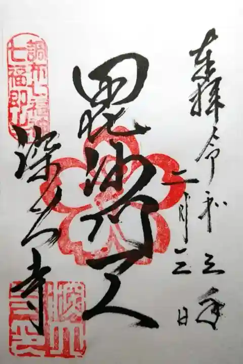真ん中に毘沙門天と書かれ、左上に「調布七福神 七福即生」の印、真ん中に梵字(毘沙門天)が入った桜花の印、左下に深大寺の文字、深大寺印が押されています。