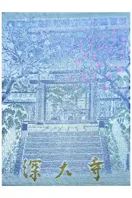 紫色を基調とした御朱印帳で、表面は深大寺山門の風景が描かれ、下部に深大寺の文字、裏面は国宝「釈迦如来倚像」がデザインされ、右上に深大寺の文字、左に国宝釈迦如来倚像(白鳳佛)の文字が入っています。